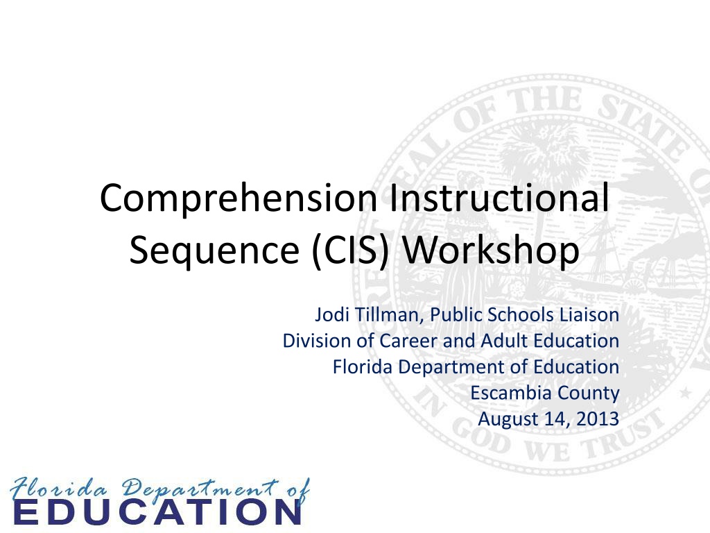 Comprehension Instructional Sequence (CIS) Workshop Jodi Tillman, Public Schools Liaison Division of Career and Adult Education Florida Department of Education Escambia County August 14, 2013