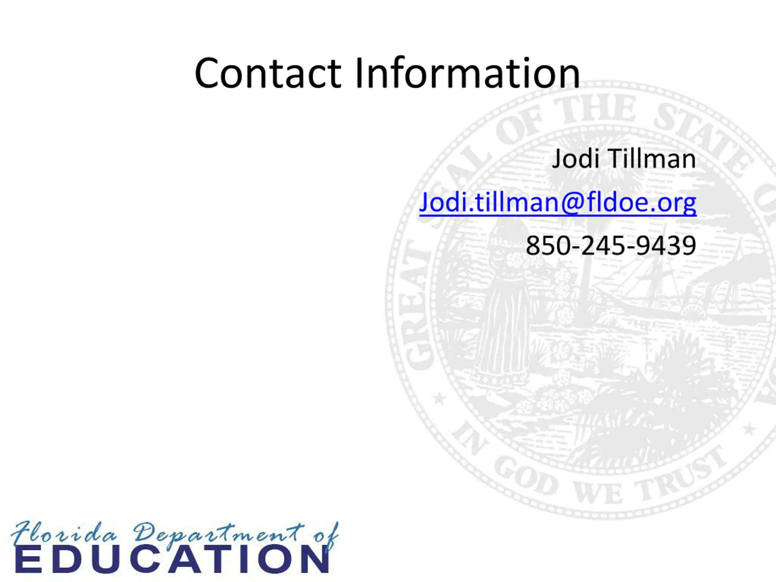 Contact Information Jodi Tillman Jodi.tillman@fldoe.org 850-245-9439