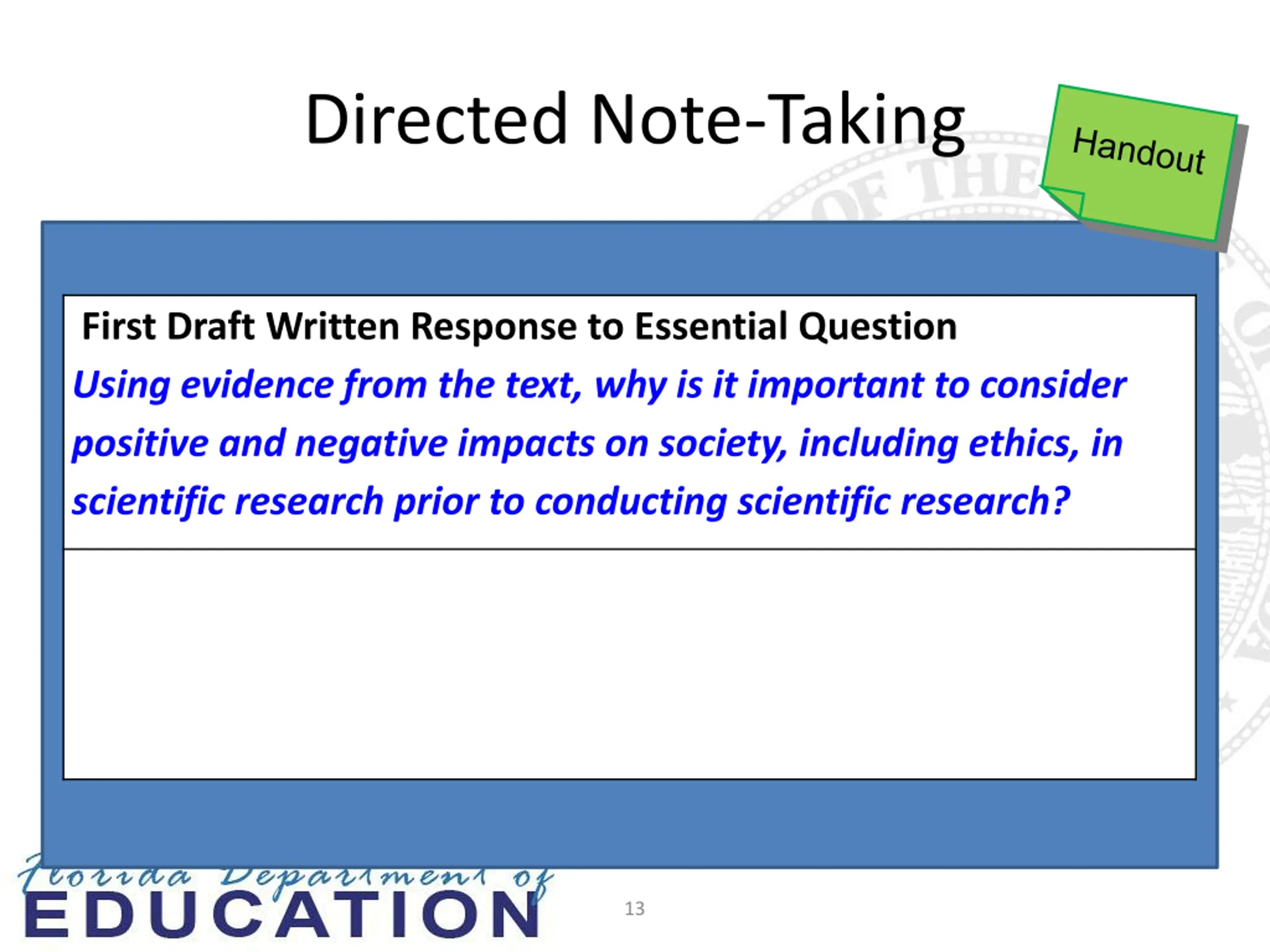 Directed Note-Taking First Draft Written Response to Essential Question Using evidence from the text, why is it important to consider positive and negative impacts on society, including ethics, in scientific research prior to conducting scientific research? 13