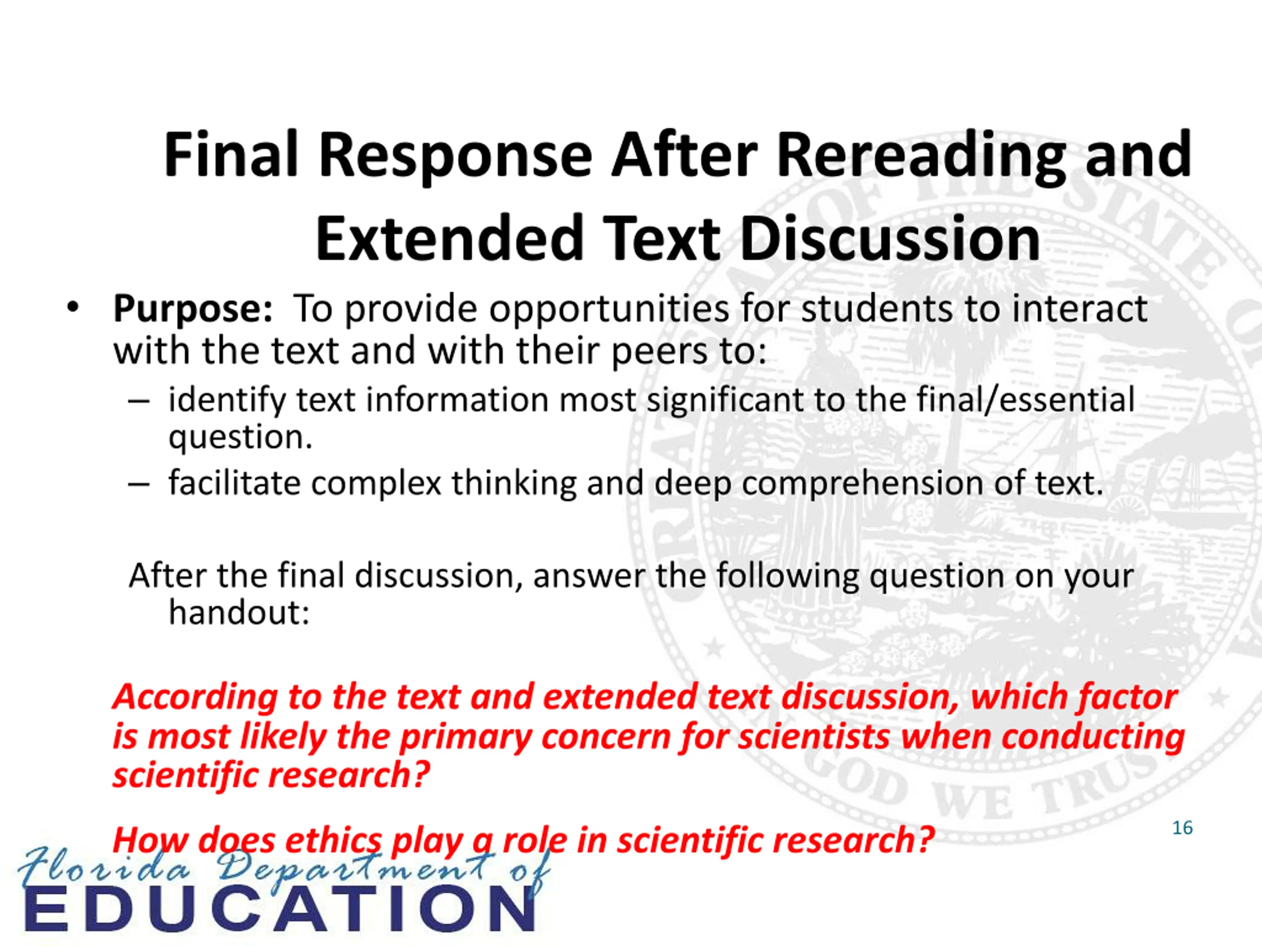 Final Response After Rereading and Extended Text Discussion Purpose: To provide opportunities for students to interact with the text and with their peers to: identify text information most significant to the final/essential question. facilitate complex thinking and deep comprehension of text. After the final discussion, answer the following question on your handout: According to the text and extended text discussion, which factor is most likely the primary concern for scientists when conducting scientific research? 16 How does ethics play a role in scientific research?