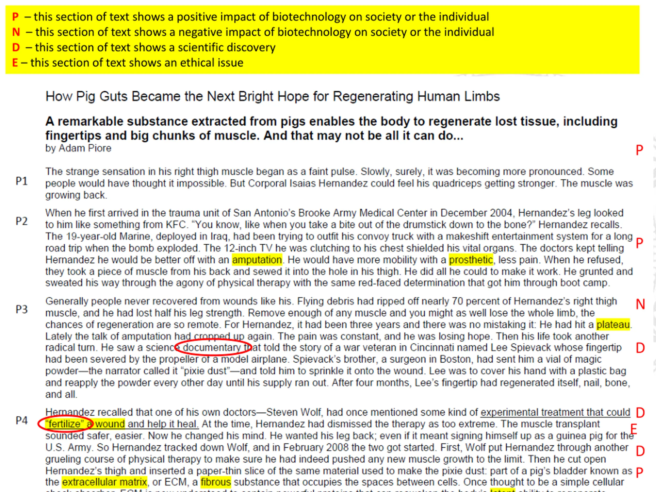 P this section of text shows a positive impact of biotechnology on society or the individual N this section of text shows a negative impact of biotechnology on society or the individual D this section of text shows a scientific discovery E this section of text shows an ethical issue Text Marking P P N D D E D P 11