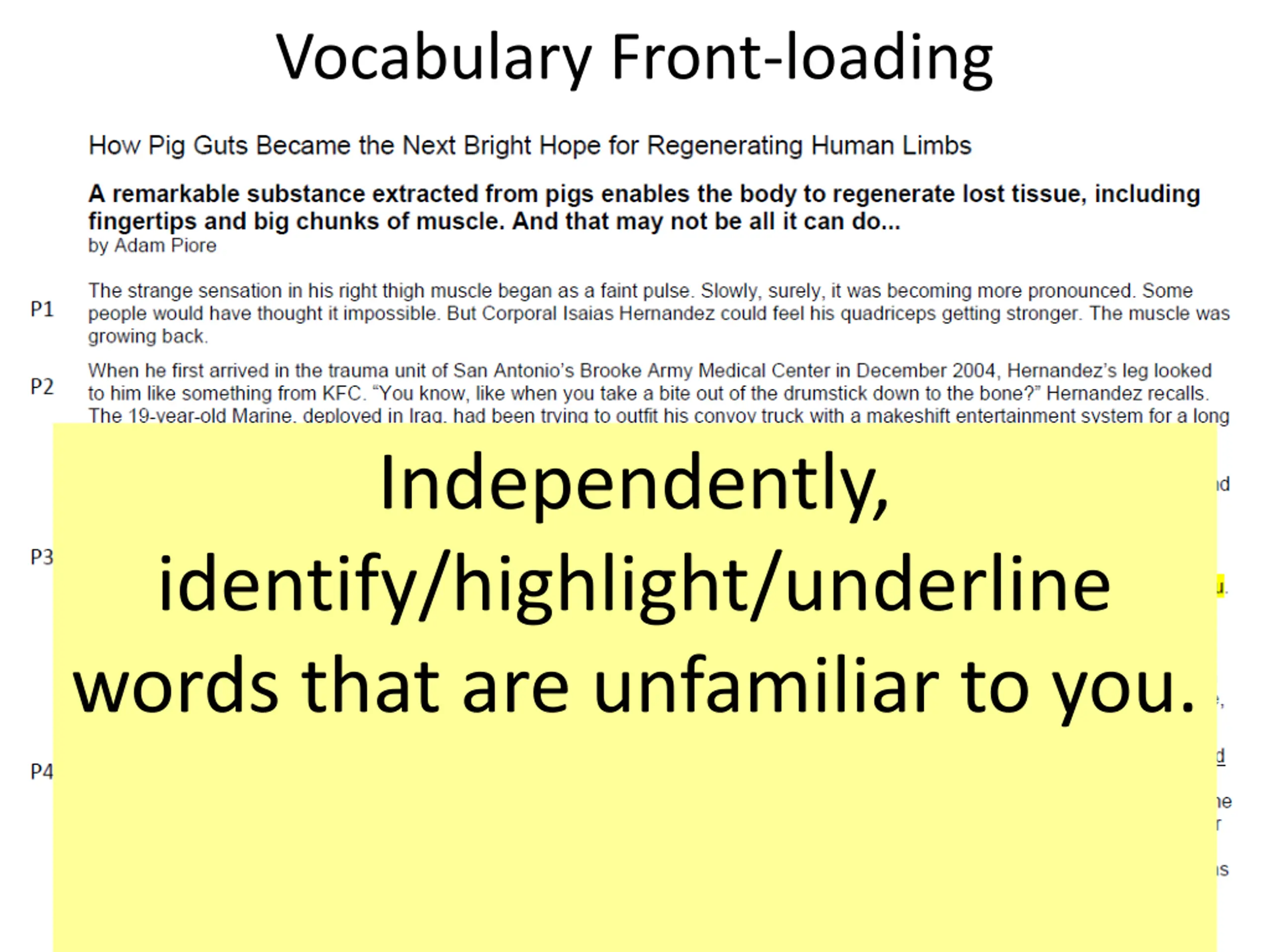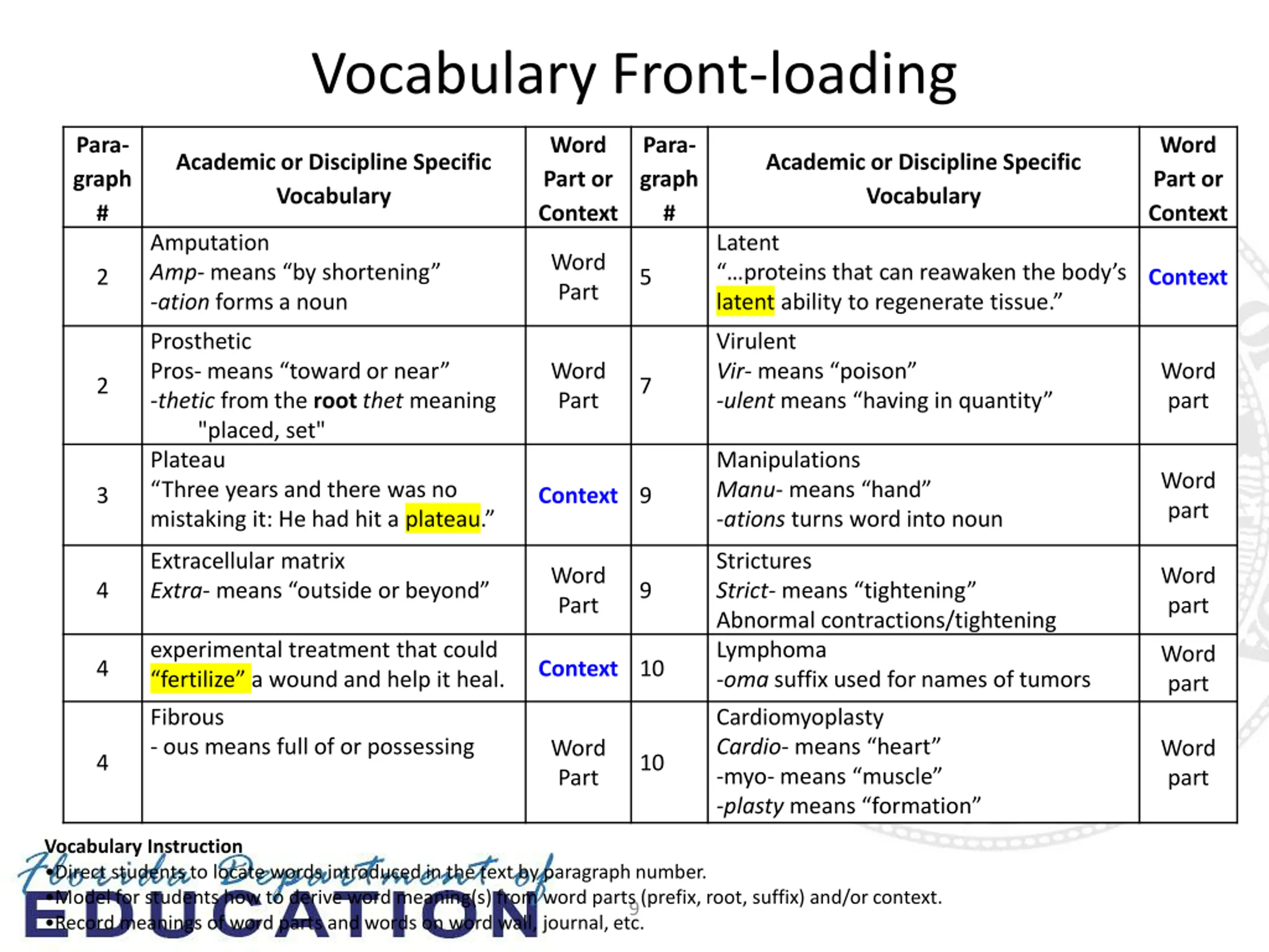 Vocabulary Front-loading Para- graph # Word Part or Context Para- graph # Word Part or Context Academic or Discipline Specific Vocabulary Academic or Discipline Specific Vocabulary Amputation Amp-means by shortening -ation forms a noun Latent proteins that can reawaken the body s latent ability to regenerate tissue. Word Part 2 5 Context Prosthetic Pros- means toward or near -thetic from the rootthet meaning "placed, set" Plateau Three years and there was no mistaking it: He had hit a plateau. Virulent Vir-means poison -ulentmeans having in quantity Word Part Word part 2 7 Manipulations Manu-means hand -ations turns word into noun Word part 3 Context 9 Extracellular matrix Extra-means outside or beyond Strictures Strict-means tightening Abnormal contractions/tightening Lymphoma -oma suffix used for names of tumors Word Part Word part 4 9 experimental treatment that could fertilize a wound and help it heal. Word part 4 Context 10 Fibrous - ous means full of or possessing Cardiomyoplasty Cardio-means heart -myo- means muscle -plastymeans formation Word Part Word part 4 10 Vocabulary Instruction Direct students to locate words introduced in the text by paragraph number. Model for students how to derive word meaning(s) from word parts (prefix, root, suffix) and/or context. Record meanings of word parts and words on word wall, journal, etc. 9
