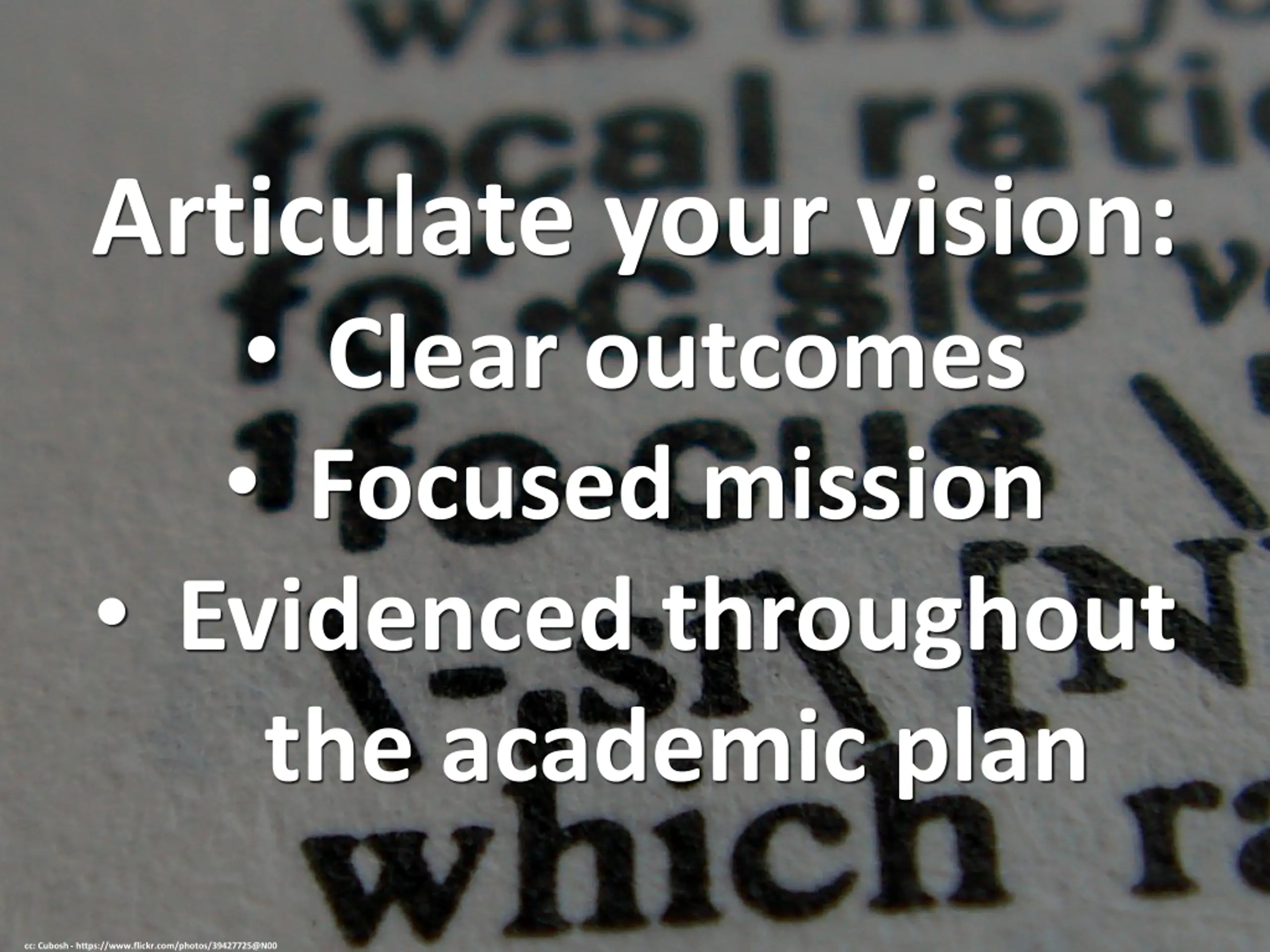 Articulate your vision: Clear outcomes Focused mission Evidenced throughout the academic plan cc: Cubosh - https://www.flickr.com/photos/39427725@N00