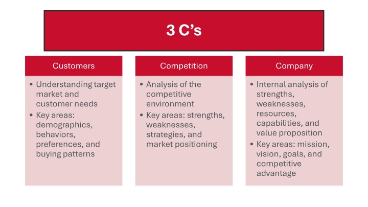 3 Cs Customers Competition Company Understanding target market and customer needs Key areas: demographics, behaviors, preferences, and buying patterns Analysis of the competitive environment Key areas: strengths, weaknesses, strategies, and market positioning Internal analysis of strengths, weaknesses, resources, capabilities, and value proposition Key areas: mission, vision, goals, and competitive advantage