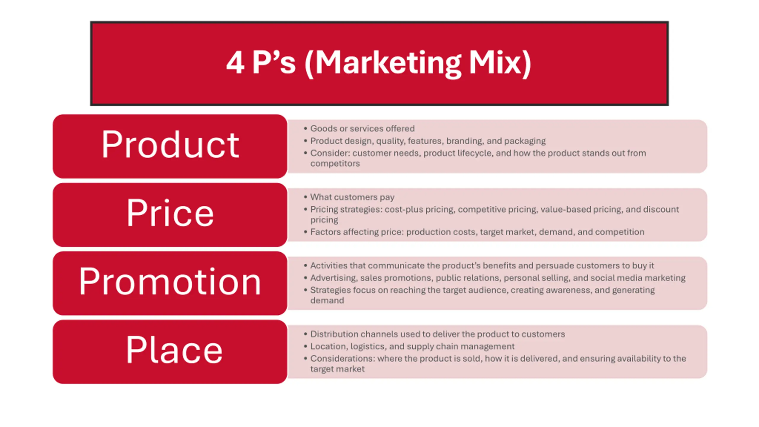4 Ps (Marketing Mix) Product Price Promotion Place Goods or services offered Product design, quality, features, branding, and packaging Consider: customer needs, product lifecycle, and how the product stands out from competitors What customers pay Pricing strategies: cost-plus pricing, competitive pricing, value-based pricing, and discount pricing Factors affecting price: production costs, target market, demand, and competition Activities that communicate the product s benefits and persuade customers to buy it Advertising, sales promotions, public relations, personal selling, and social media marketing Strategies focus on reaching the target audience, creating awareness, and generating demand Distribution channels used to deliver the product to customers Location, logistics, and supply chain management Considerations: where the product is sold, how it is delivered, and ensuring availability to the target market