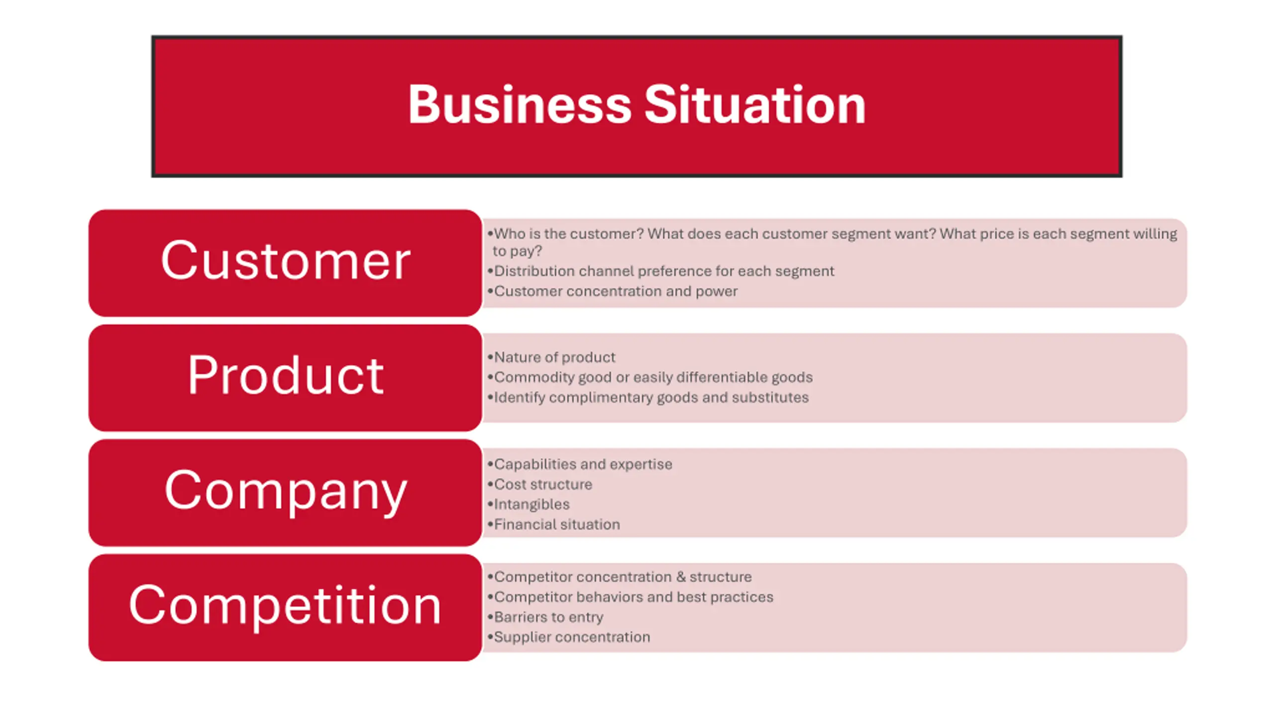 Business Situation Who is the customer? What does each customer segment want? What price is each segment willing to pay? Distribution channel preference for each segment Customer concentration and power Customer Product Nature of product Commodity good or easily differentiable goods Identify complimentary goods and substitutes Company Capabilities and expertise Cost structure Intangibles Financial situation Competitor concentration & structure Competitor behaviors and best practices Barriers to entry Supplier concentration Competition