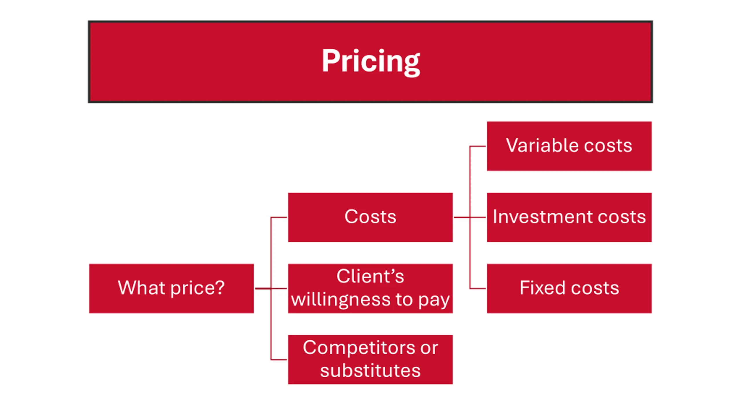Pricing Variable costs Costs Investment costs Client s What price? Fixed costs willingness to pay Competitors or substitutes