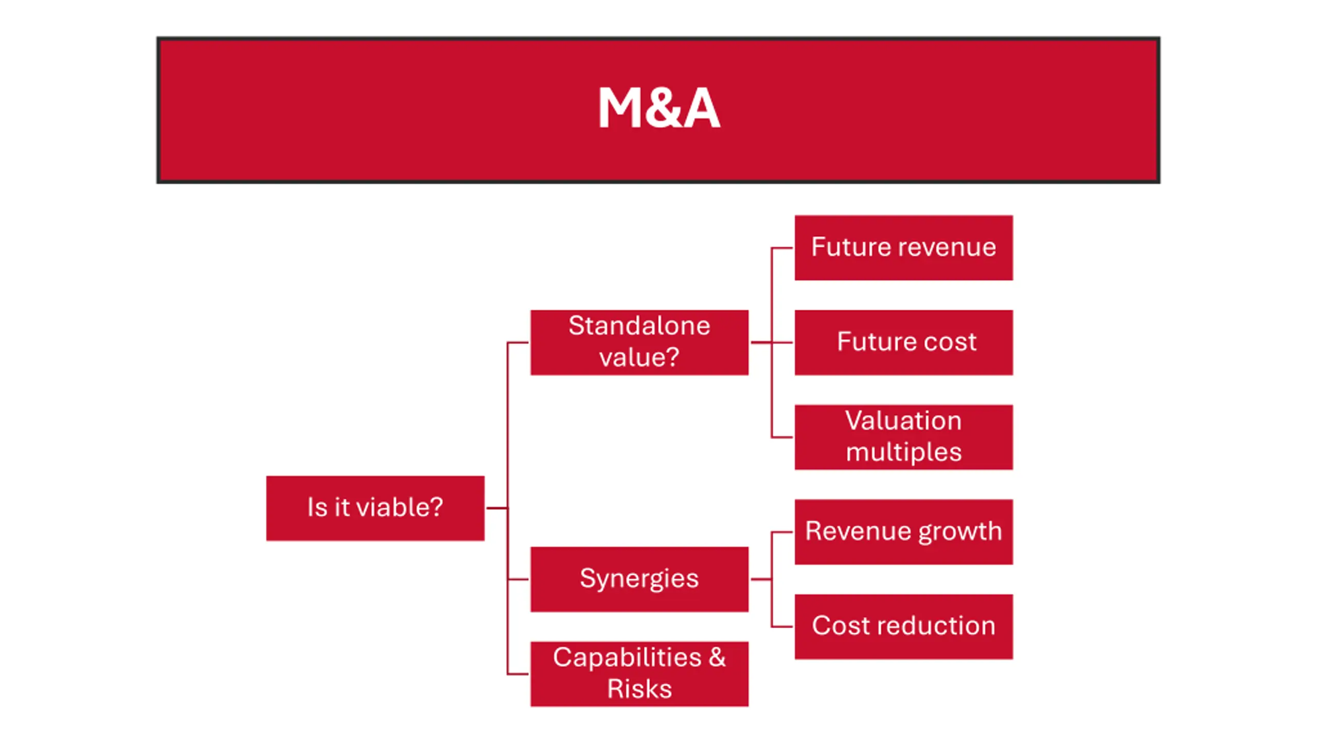 M&A Future revenue Standalone value? Future cost Valuation multiples Is it viable? Revenue growth Synergies Cost reduction Capabilities & Risks