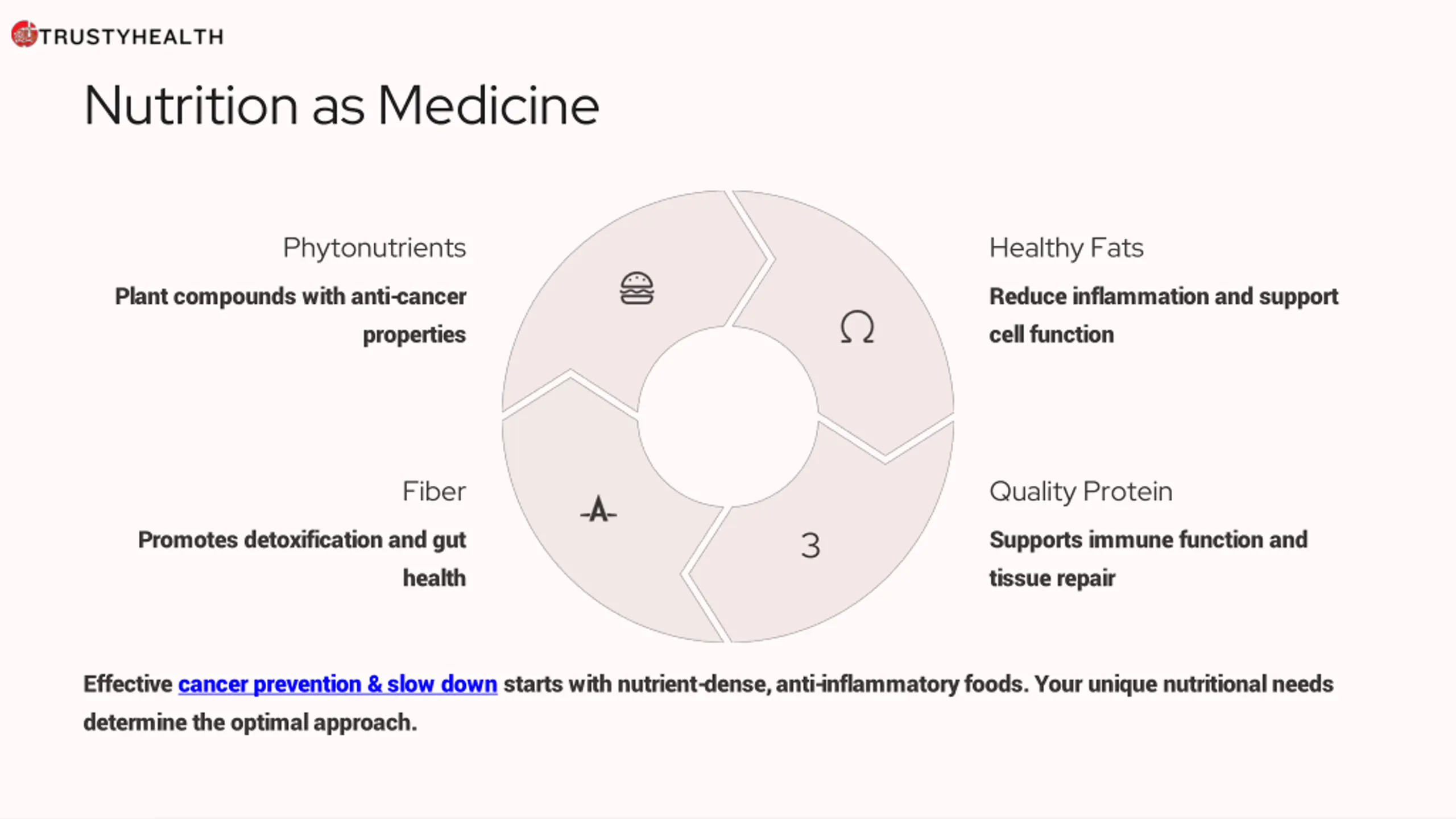 Nutrition as Medicine Phytonutrients Healthy Fats Plant compounds with anti-cancer Reduce inflammation and support cell function properties Fiber Quality Protein 3 Promotes detoxification and gut Supports immune function and tissue repair health Effective cancer prevention & slow down starts with nutrient-dense, anti-inflammatory foods. Your unique nutritional needs determine the optimal approach.