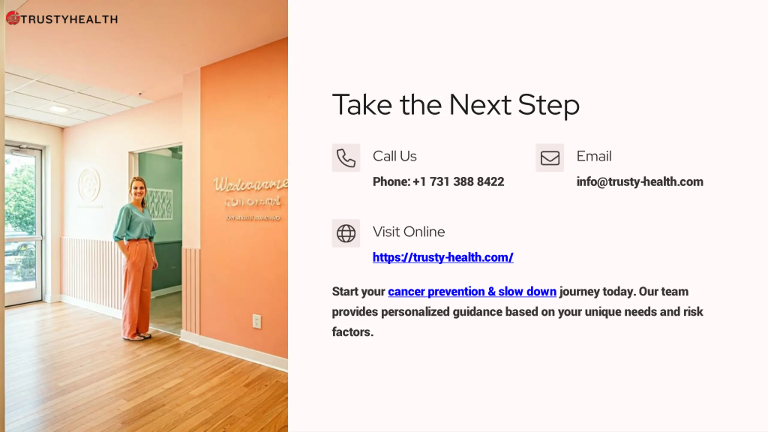 Take the Next Step Call Us Email Phone: +1 731 388 8422 info@trusty-health.com Visit Online https://trusty-health.com/ Start your cancer prevention & slow down journey today. Our team provides personalized guidance based on your unique needs and risk factors.