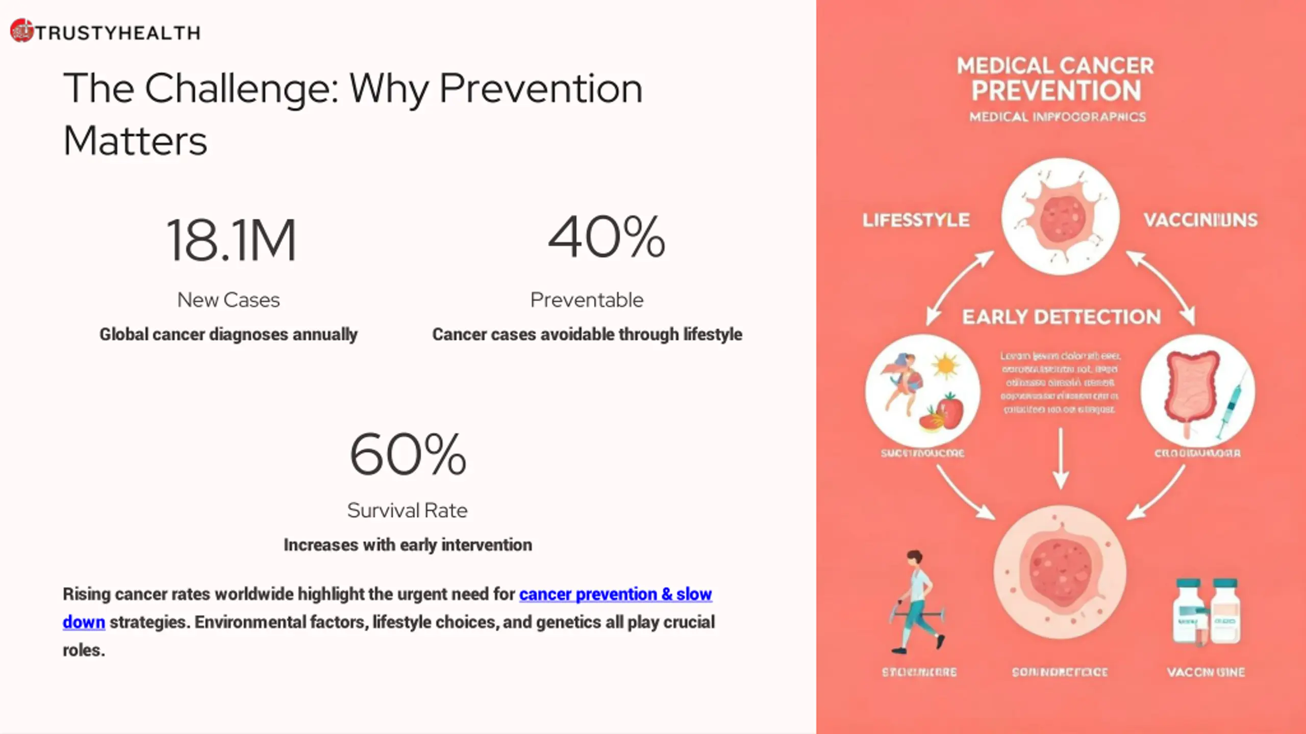 The Challenge: Why Prevention Matters 40% 18.1M New Cases Preventable Global cancer diagnoses annually Cancer cases avoidable through lifestyle 60% Survival Rate Increases with early intervention Rising cancer rates worldwide highlight the urgent need for cancer prevention & slow down strategies. Environmental factors, lifestyle choices, and genetics all play crucial roles. preencoded.png