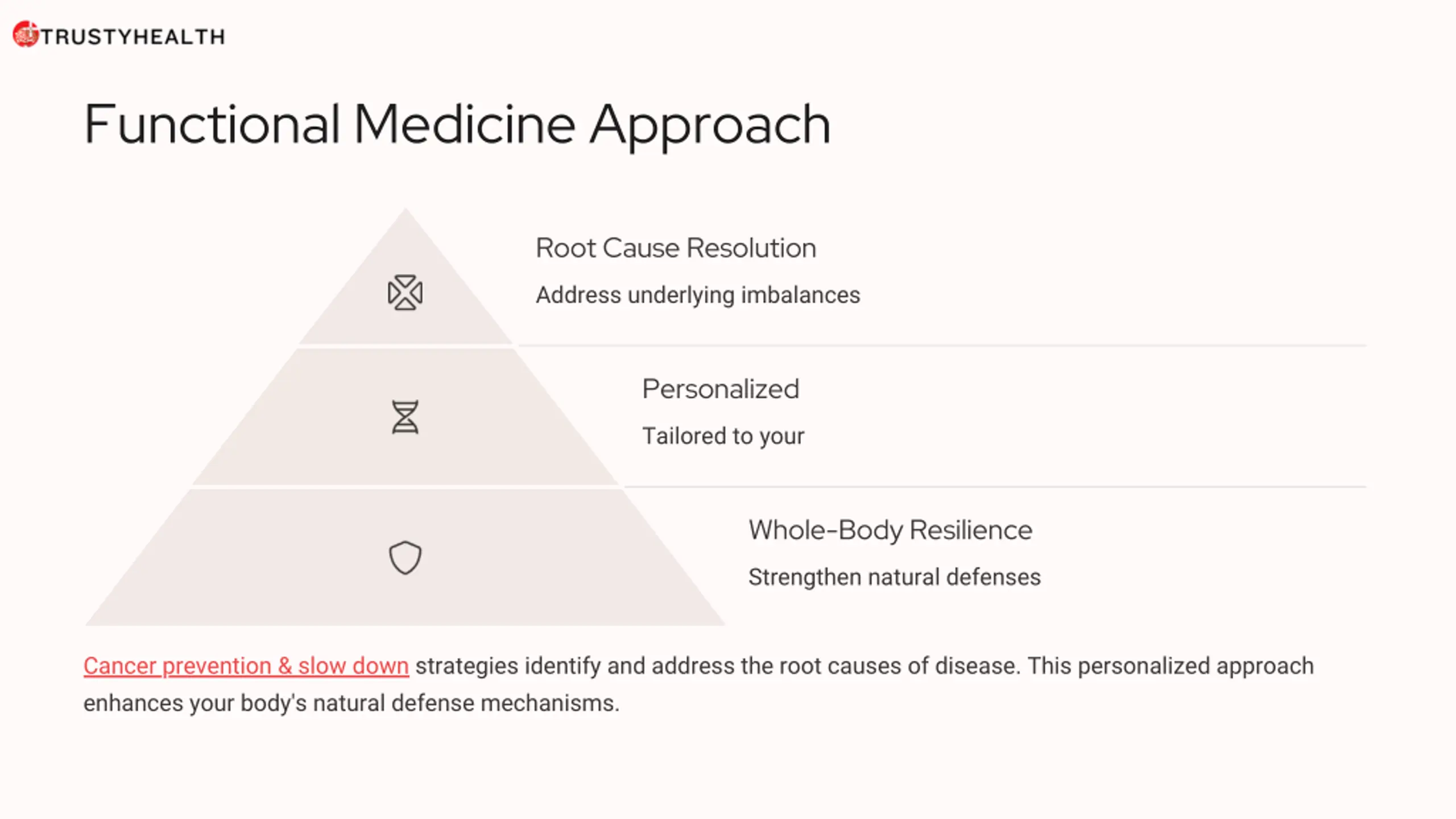 Functional Medicine Approach Root Cause Resolution Address underlying imbalances Personalized Tailored to your Whole-Body Resilience Strengthen natural defenses Cancer prevention & slow down strategies identify and address the root causes of disease. This personalized approach enhances your body's natural defense mechanisms.