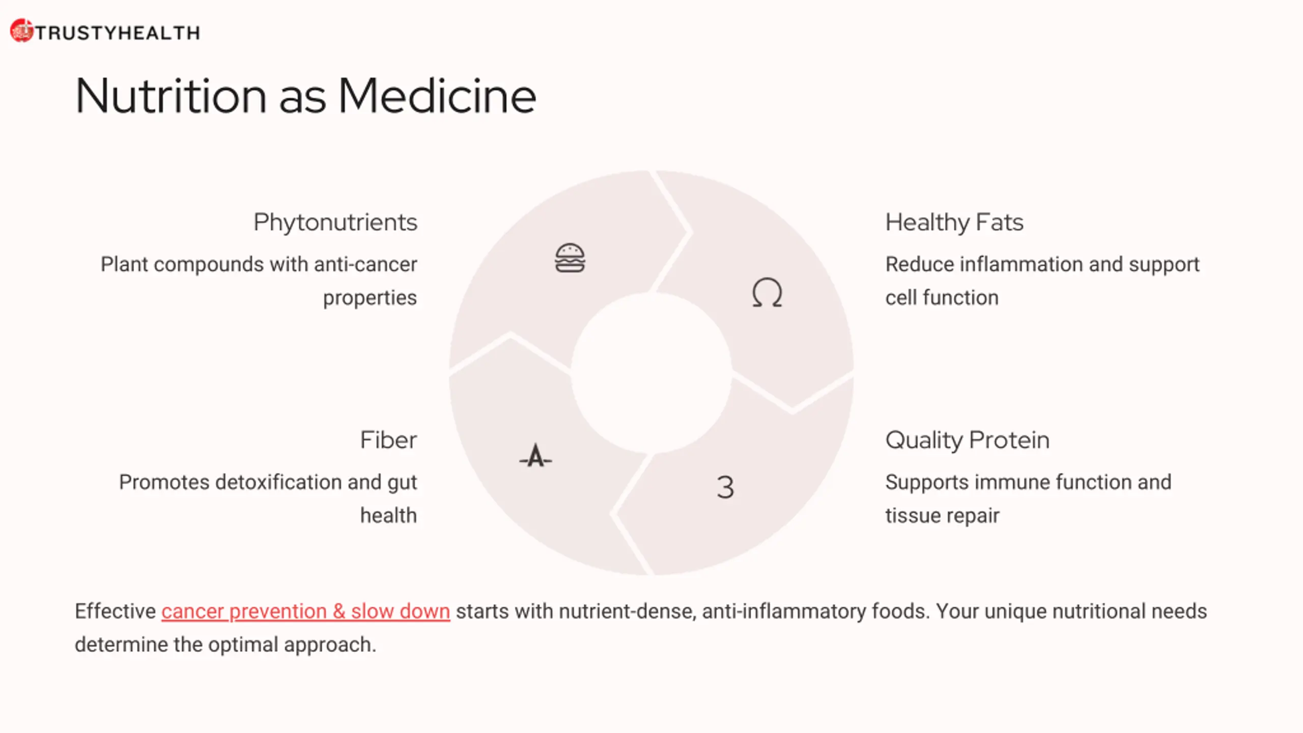 Nutrition as Medicine Phytonutrients Healthy Fats Plant compounds with anti-cancer Reduce inflammation and support cell function properties Fiber Quality Protein 3 Promotes detoxification and gut Supports immune function and tissue repair health Effective cancer prevention & slow down starts with nutrient-dense, anti-inflammatory foods. Your unique nutritional needs determine the optimal approach.