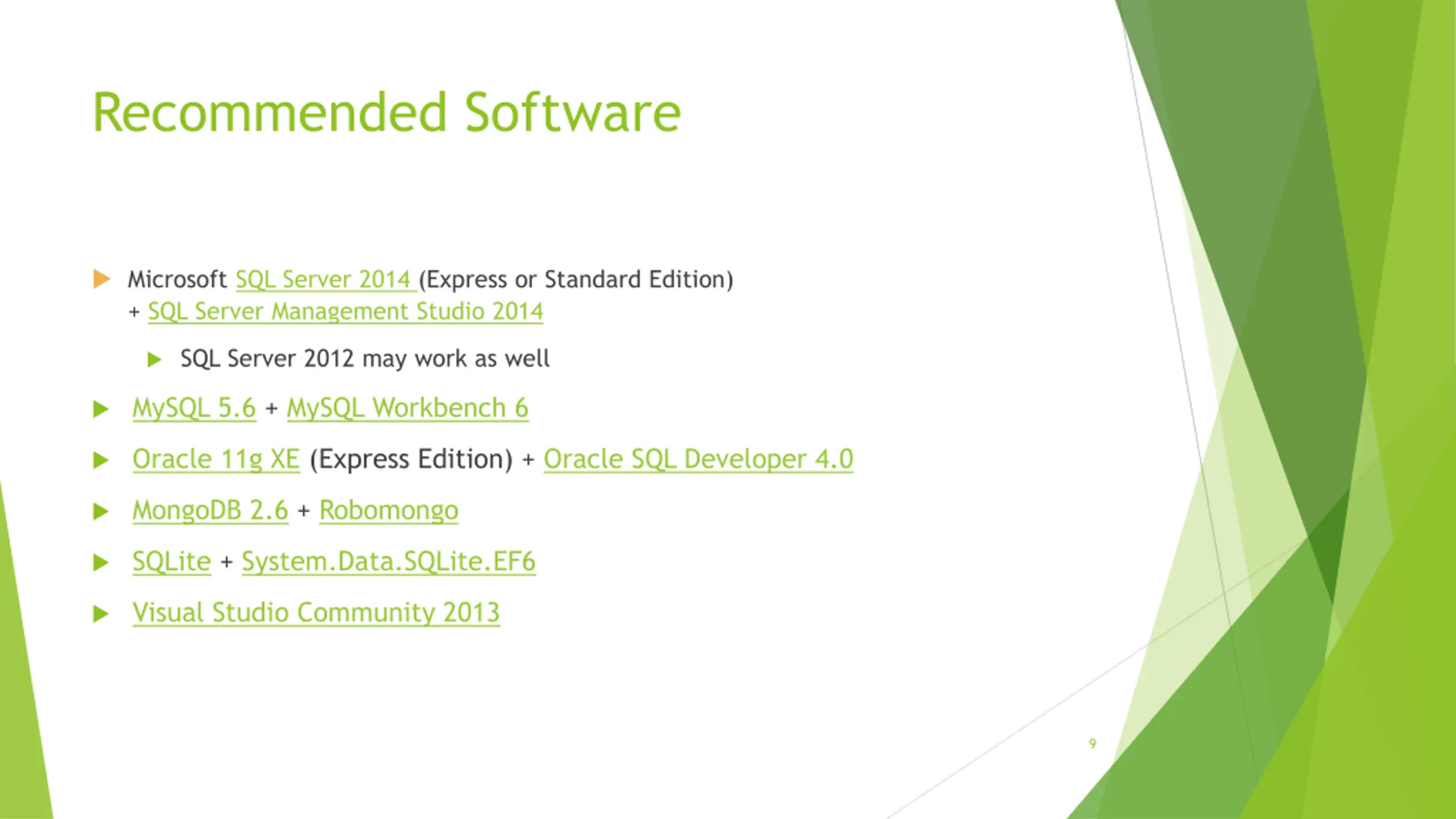 Recommended Software Microsoft SQL Server 2014 (Express or Standard Edition) + SQL Server Management Studio 2014 SQL Server 2012 may work as well MySQL 5.6 + MySQL Workbench 6 Oracle 11g XE (Express Edition) + Oracle SQL Developer 4.0 MongoDB 2.6 + Robomongo SQLite + System.Data.SQLite.EF6 Visual Studio Community 2013 9