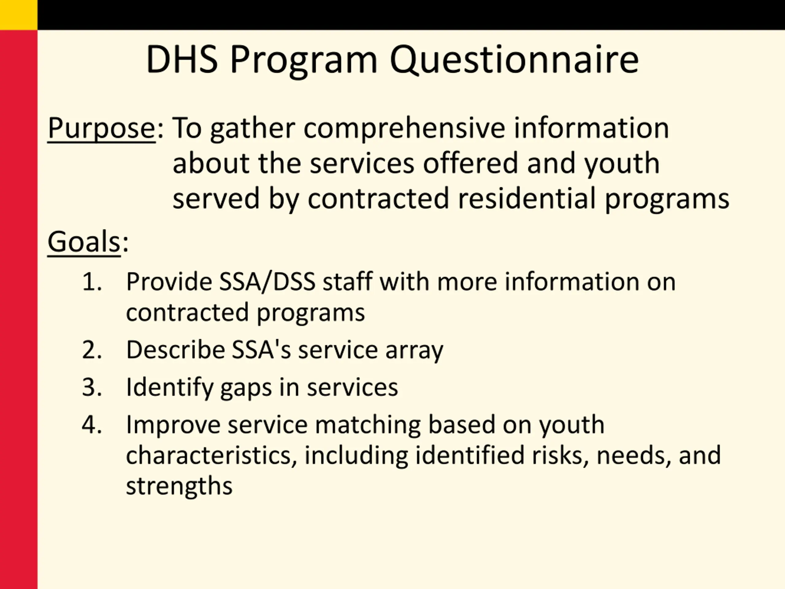 DHS Program Questionnaire Purpose: To gather comprehensive information about the services offered and youth served by contracted residential programs Goals: 1. Provide SSA/DSS staff with more information on contracted programs 2. Describe SSA's service array 3. Identify gaps in services 4. Improve service matching based on youth characteristics, including identified risks, needs, and strengths