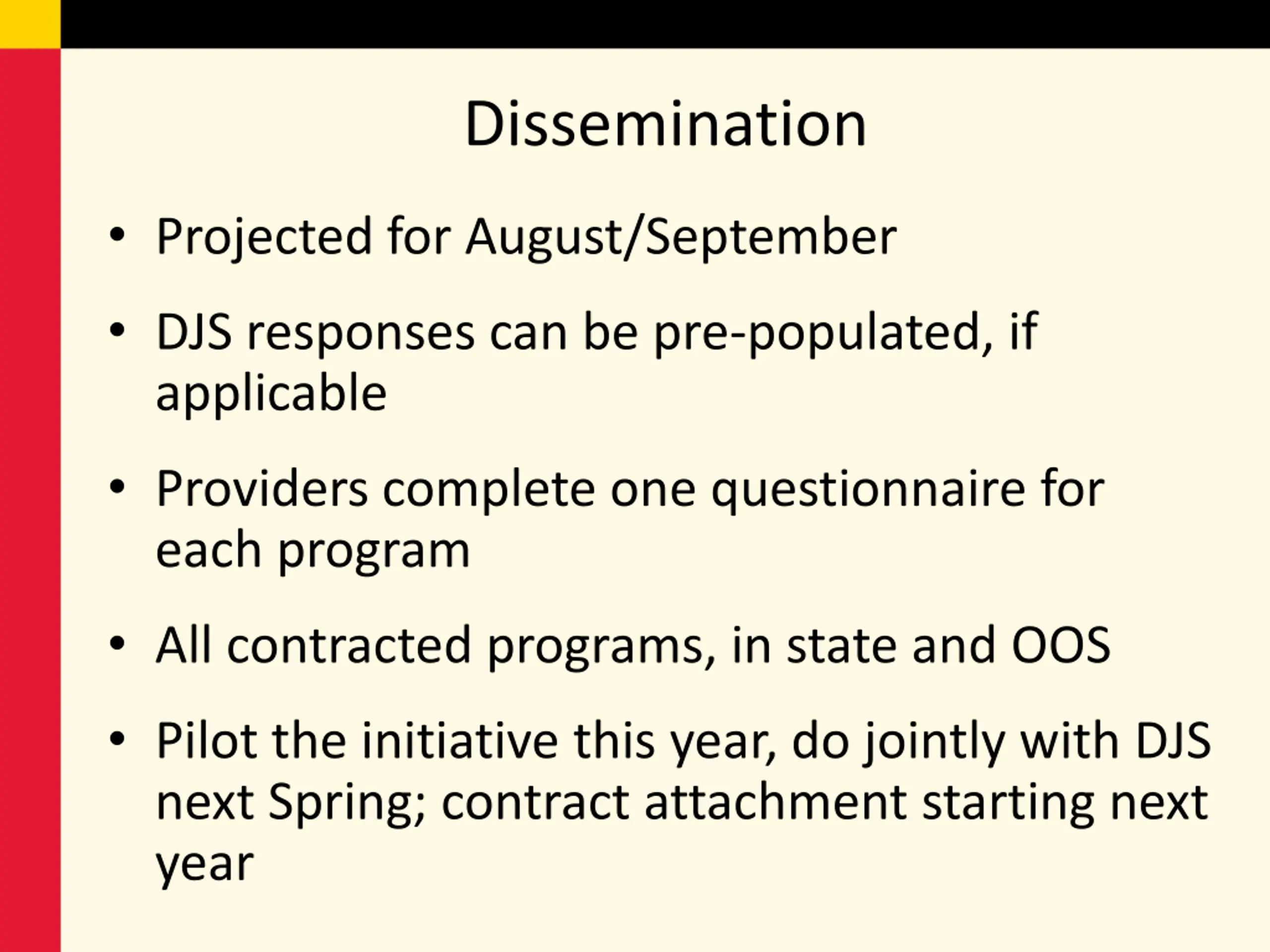 Dissemination Projected for August/September DJS responses can be pre-populated, if applicable Providers complete one questionnaire for each program All contracted programs, in state and OOS Pilot the initiative this year, do jointly with DJS next Spring; contract attachment starting next year