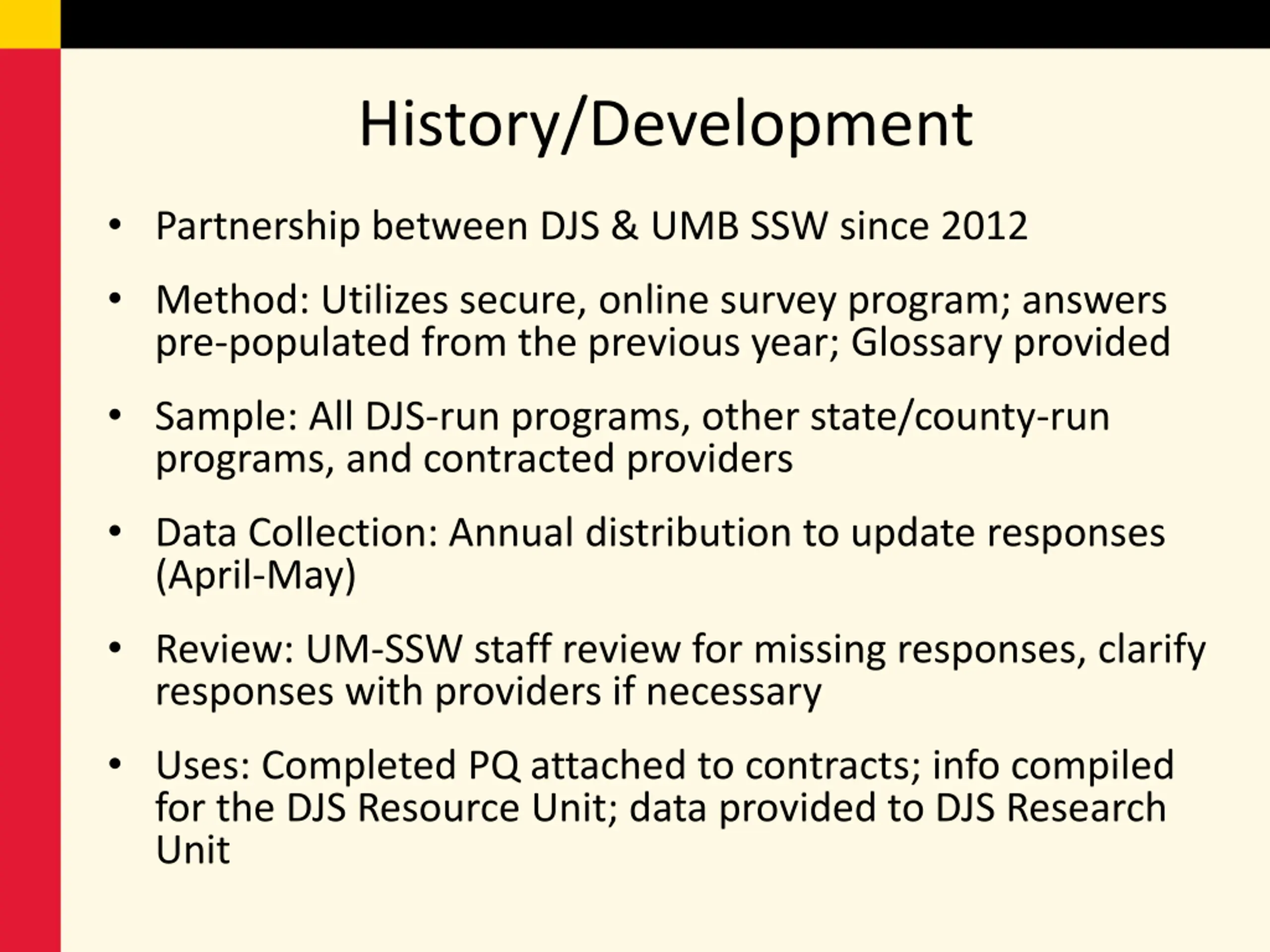 History/Development Partnership between DJS & UMB SSW since 2012 Method: Utilizes secure, online survey program; answers pre-populated from the previous year; Glossary provided Sample: All DJS-run programs, other state/county-run programs, and contracted providers Data Collection: Annual distribution to update responses (April-May) Review: UM-SSW staff review for missing responses, clarify responses with providers if necessary Uses: Completed PQ attached to contracts; info compiled for the DJS Resource Unit; data provided to DJS Research Unit