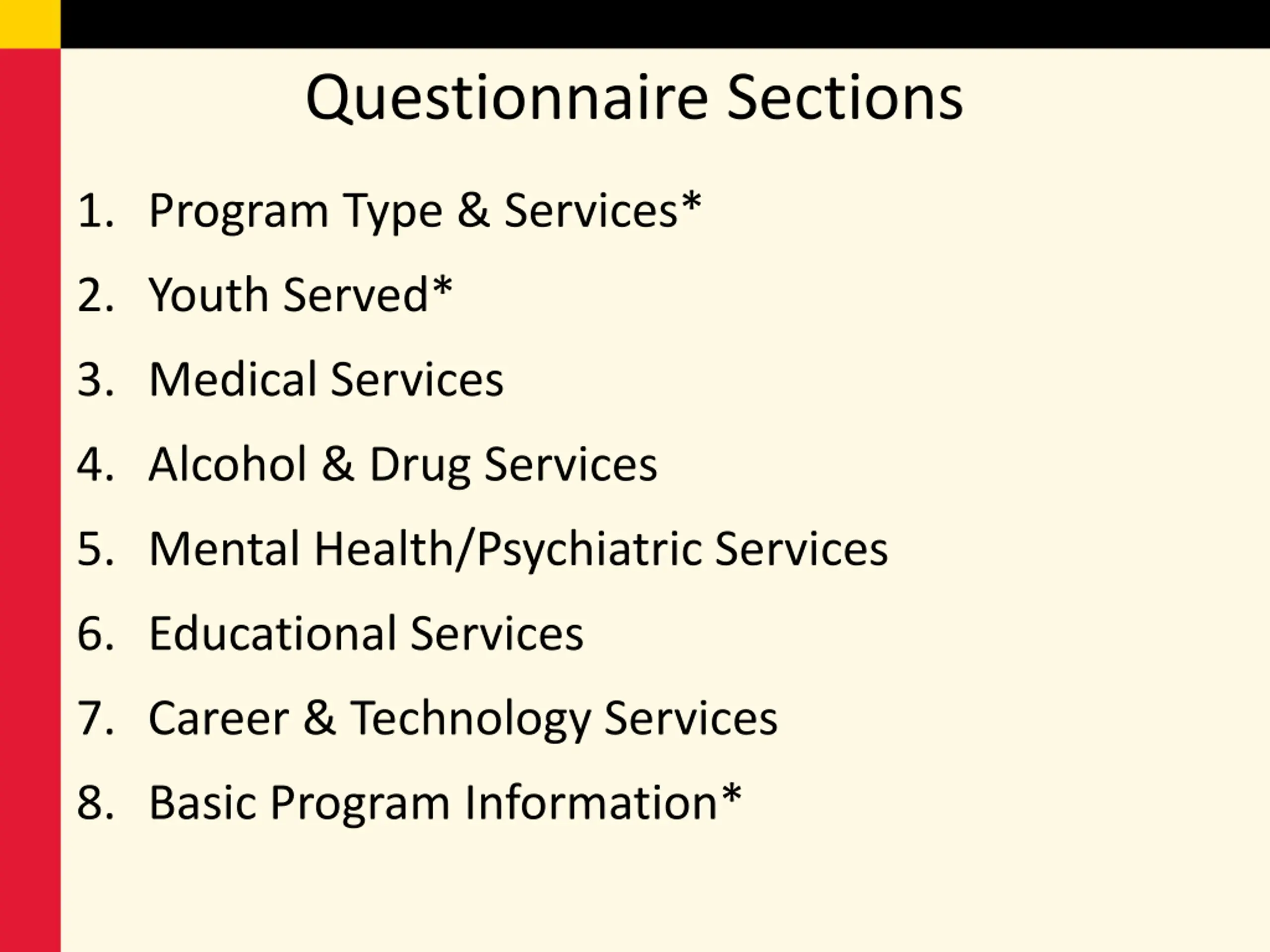 Questionnaire Sections 1. Program Type & Services* 2. Youth Served* 3. Medical Services 4. Alcohol & Drug Services 5. Mental Health/Psychiatric Services 6. Educational Services 7. Career & Technology Services 8. Basic Program Information*