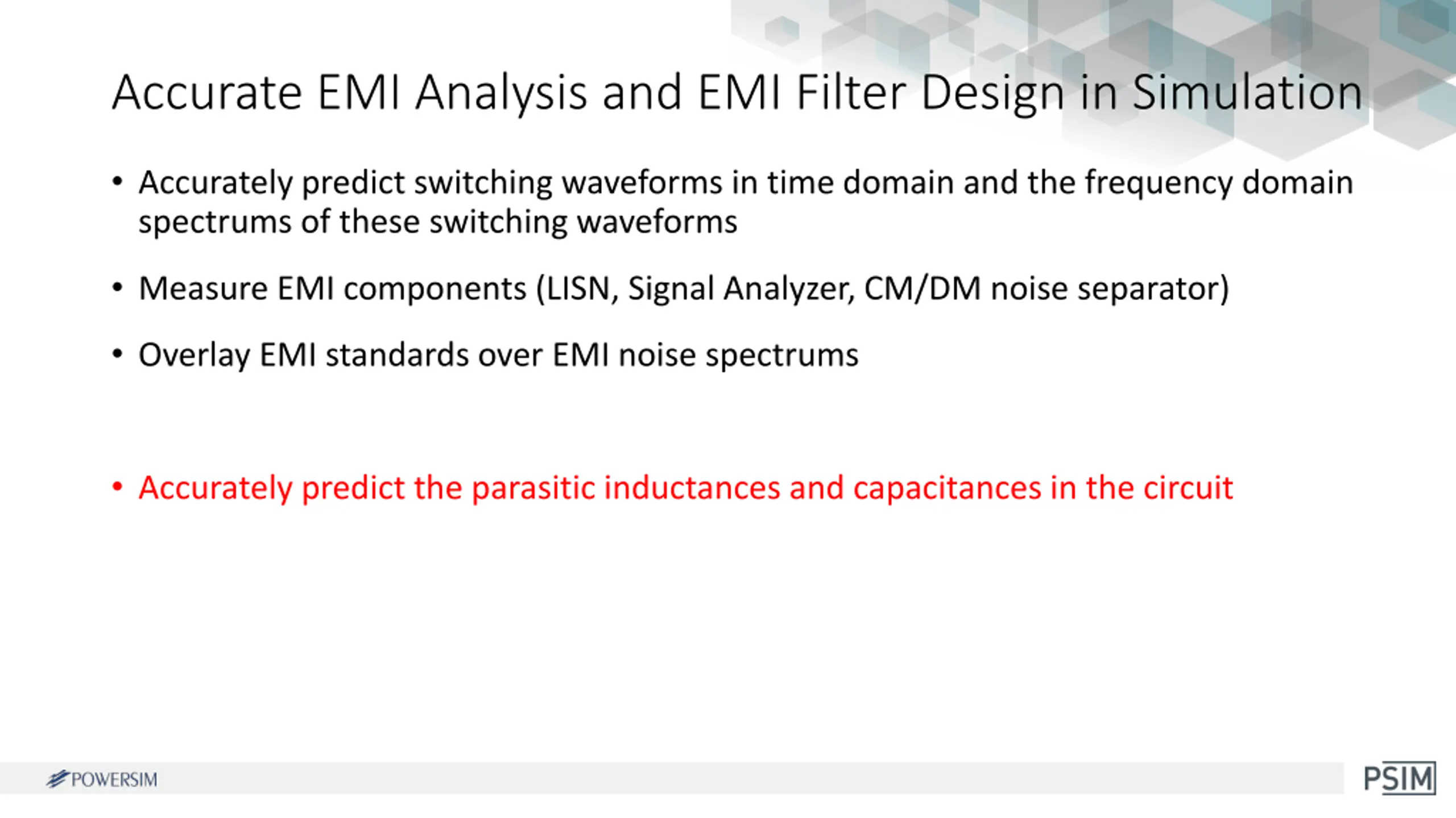 Accurate EMI Analysis and EMI Filter Design in Simulation Accurately predict switching waveforms in time domain and the frequency domain spectrums of these switching waveforms Measure EMI components (LISN, Signal Analyzer, CM/DM noise separator) Overlay EMI standards over EMI noise spectrums Accurately predict the parasitic inductances and capacitances in the circuit