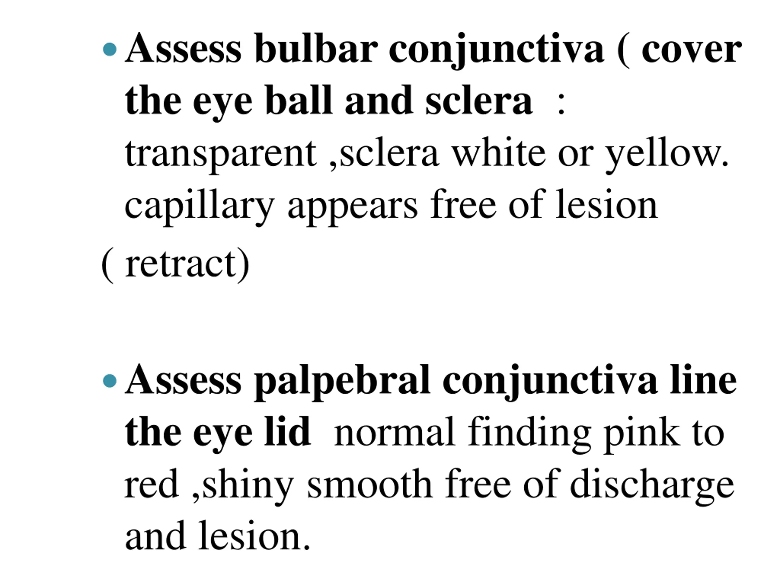 Assess bulbar conjunctiva ( cover the eye ball and sclera : transparent ,sclera white or yellow. capillary appears free of lesion ( retract) Assess palpebral conjunctiva line the eye lid normal finding pink to red ,shiny smooth free of discharge and lesion.