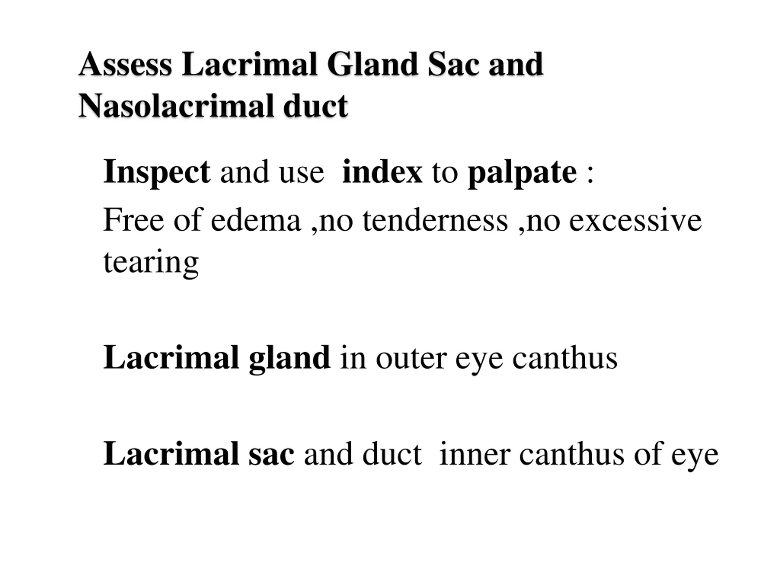 Assess Lacrimal Gland Sac and Nasolacrimal duct Inspect and use index to palpate : Free of edema ,no tenderness ,no excessive tearing Lacrimal gland in outer eye canthus Lacrimal sac and duct inner canthus of eye