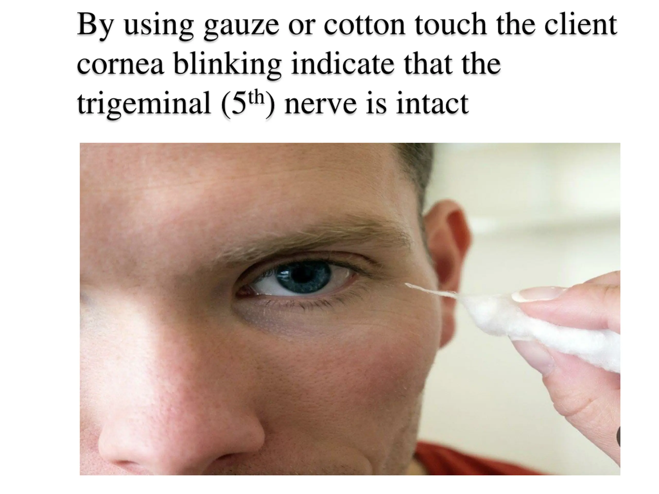 By using gauze or cotton touch the client cornea blinking indicate that the trigeminal (5th) nerve is intact