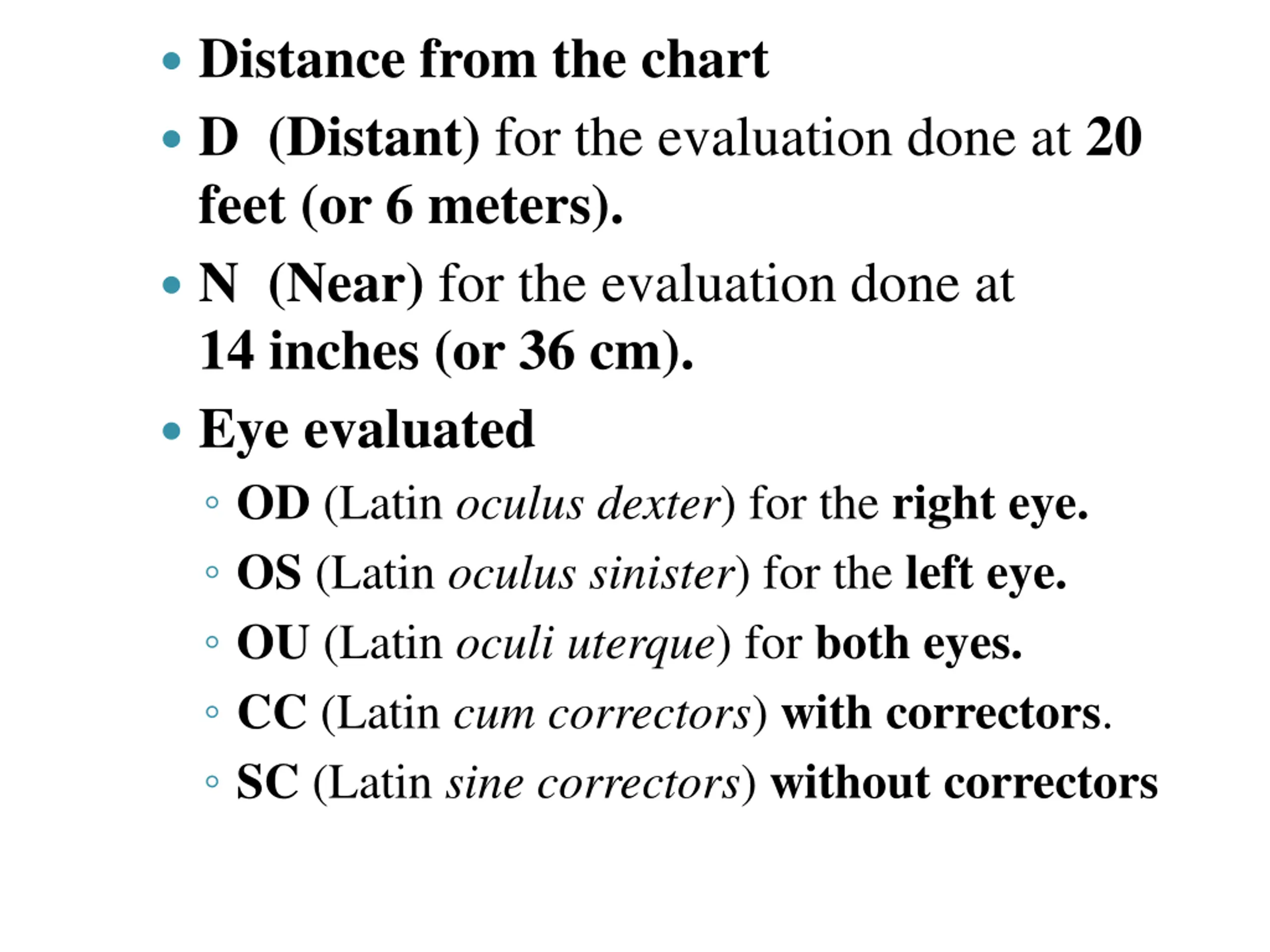 Distance from the chart D (Distant) for the evaluation done at 20 feet (or 6 meters). N (Near) for the evaluation done at 14 inches (or 36 cm). Eye evaluated OD (Latin oculus dexter) for the right eye. OS (Latin oculus sinister) for the left eye. OU (Latin oculi uterque) for both eyes. CC (Latin cum correctors) with correctors. SC (Latin sine correctors) without correctors
