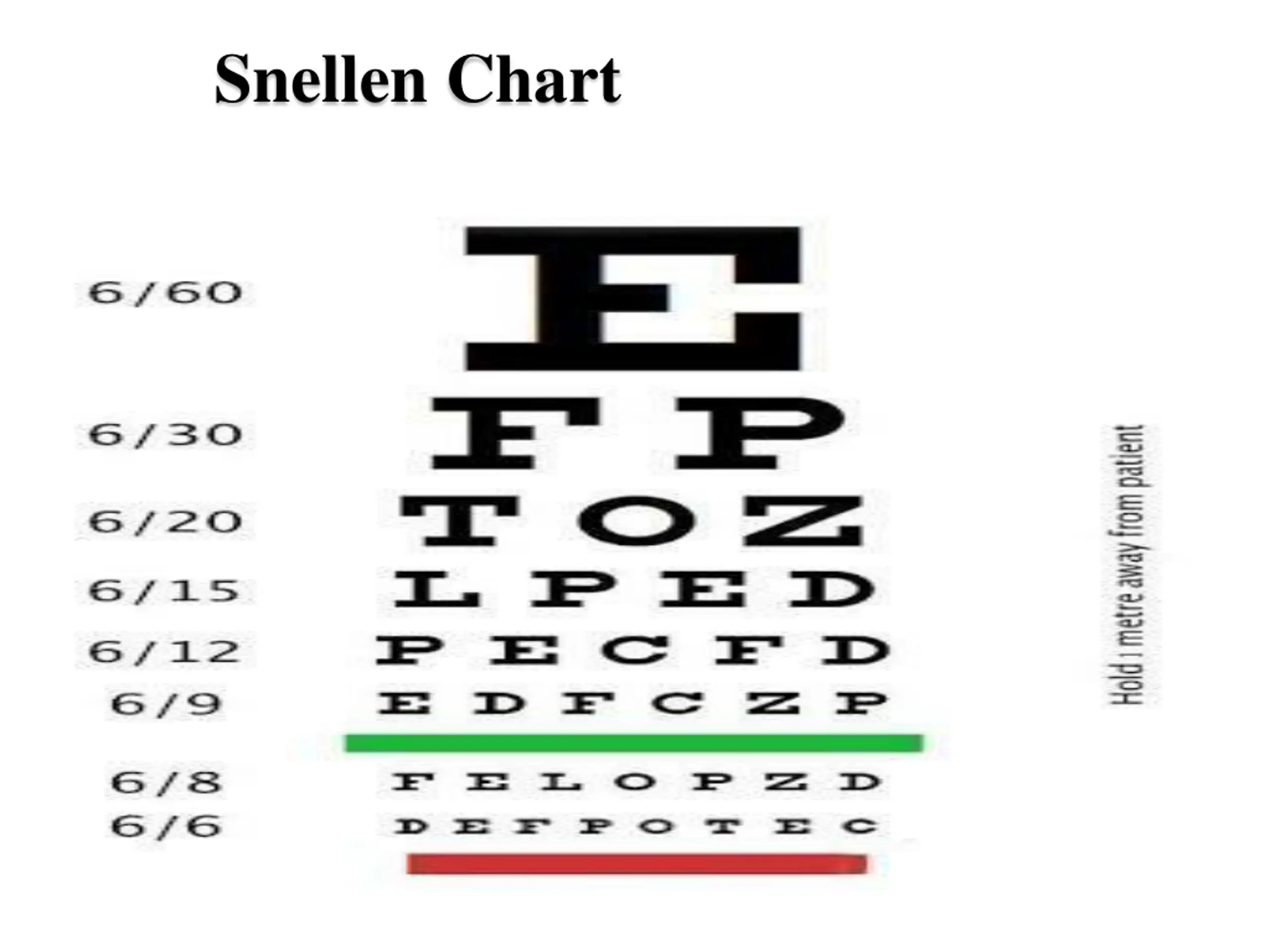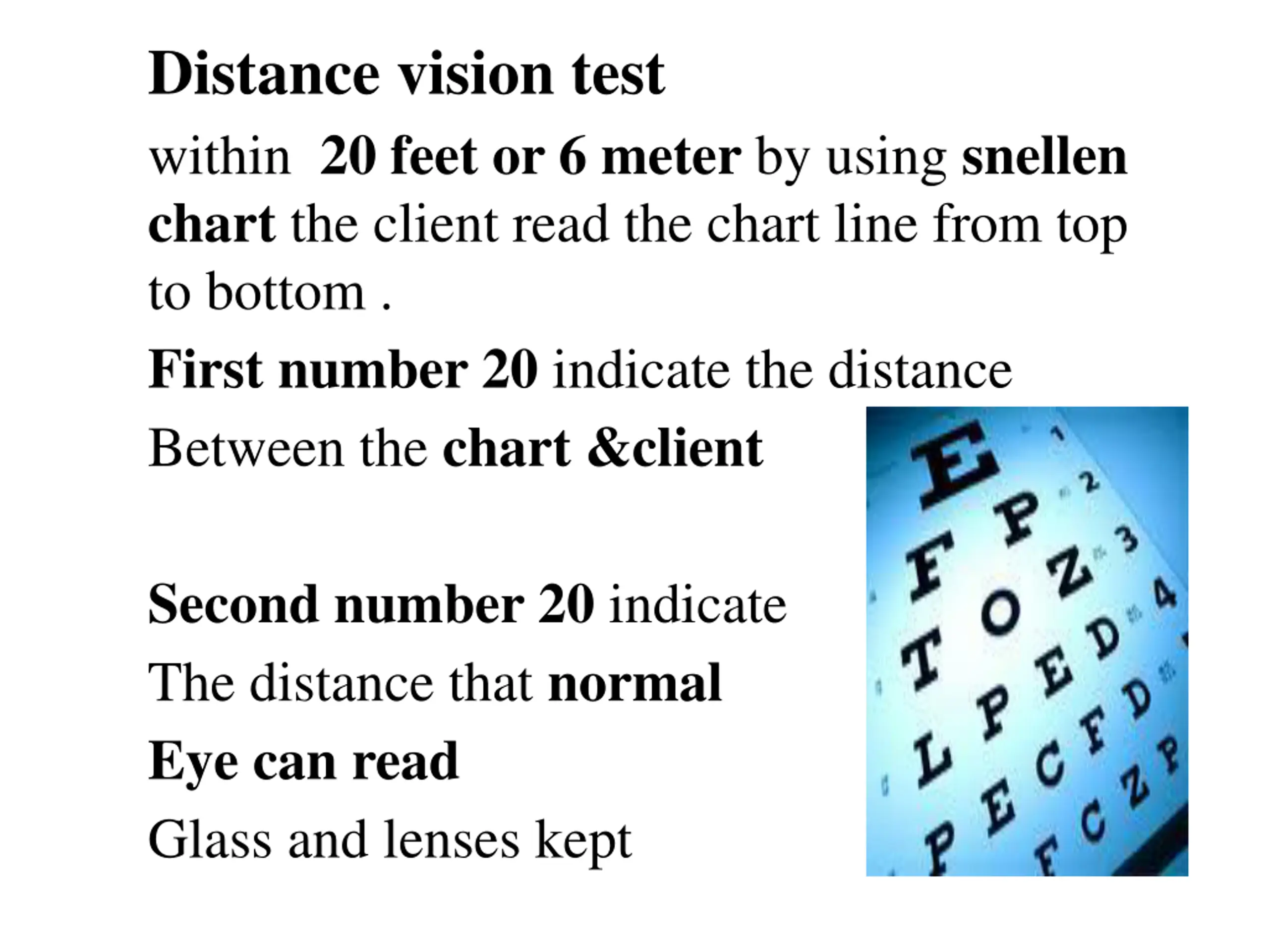 Distance vision test within 20 feet or 6 meter by using snellen chart the client read the chart line from top to bottom . First number 20 indicate the distance Between the chart &client Second number 20 indicate The distance that normal Eye can read Glass and lenses kept