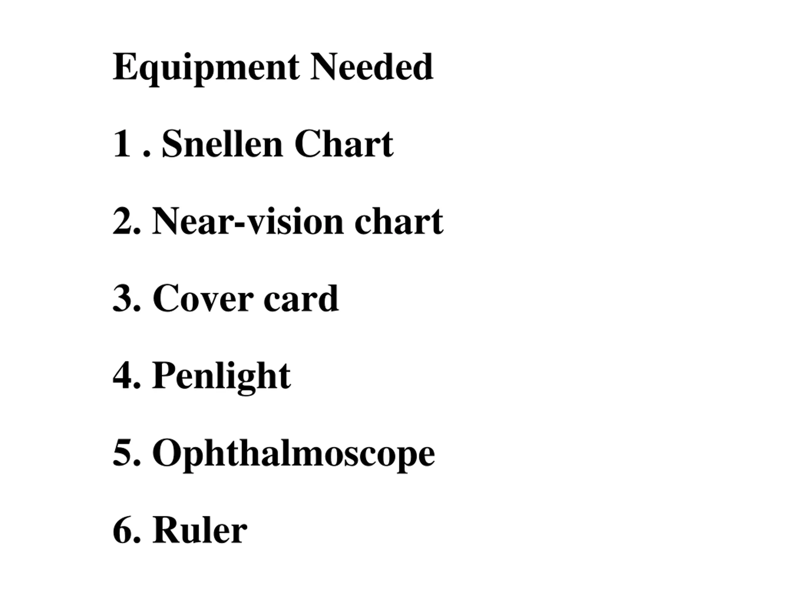 Equipment Needed 1 . Snellen Chart 2. Near-vision chart 3. Cover card 4. Penlight 5. Ophthalmoscope 6. Ruler