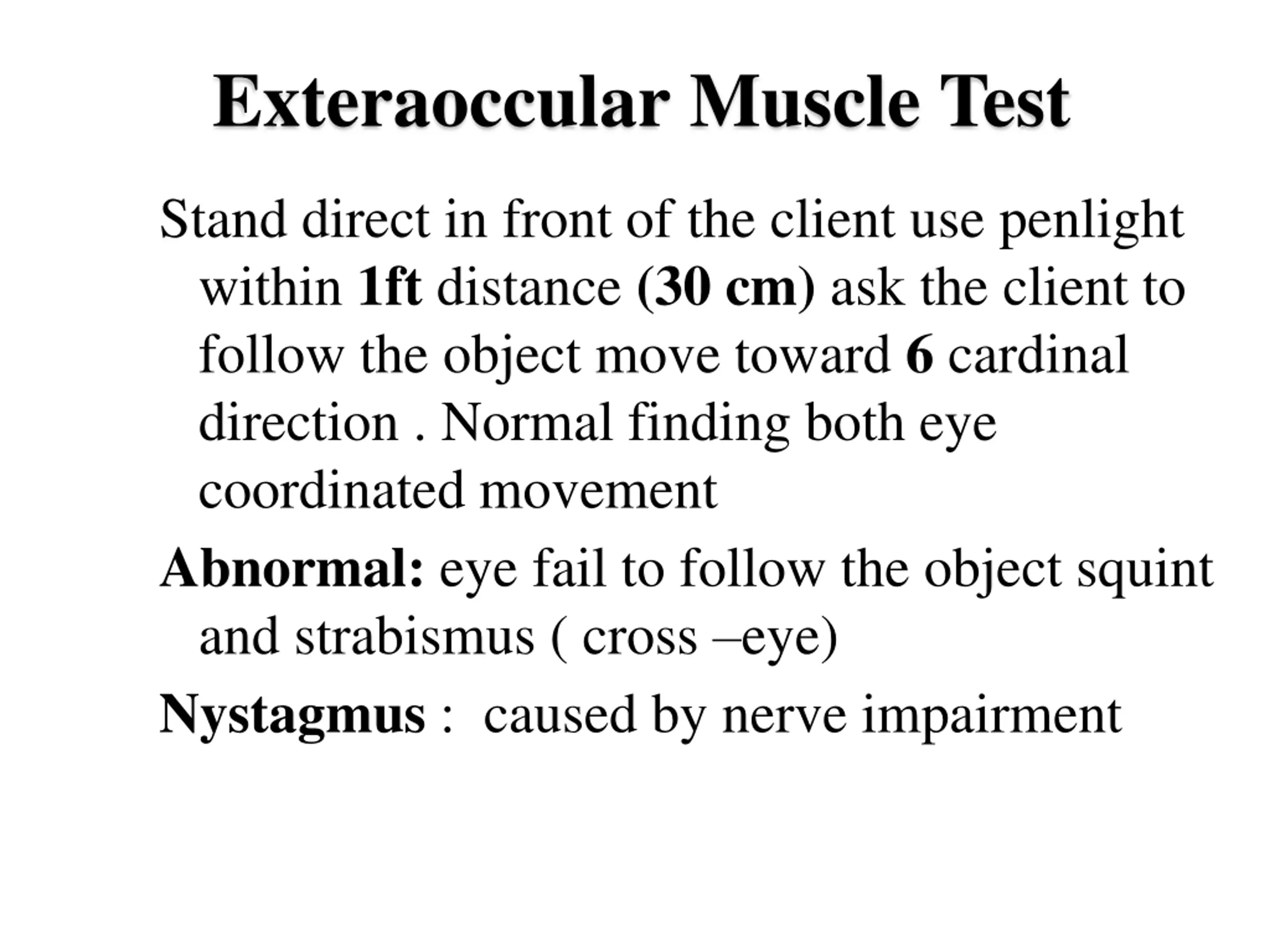 Exteraoccular Muscle Test Stand direct in front of the client use penlight within 1ft distance (30 cm) ask the client to follow the object move toward 6 cardinal direction . Normal finding both eye coordinated movement Abnormal: eye fail to follow the object squint and strabismus ( cross eye) Nystagmus : caused by nerve impairment