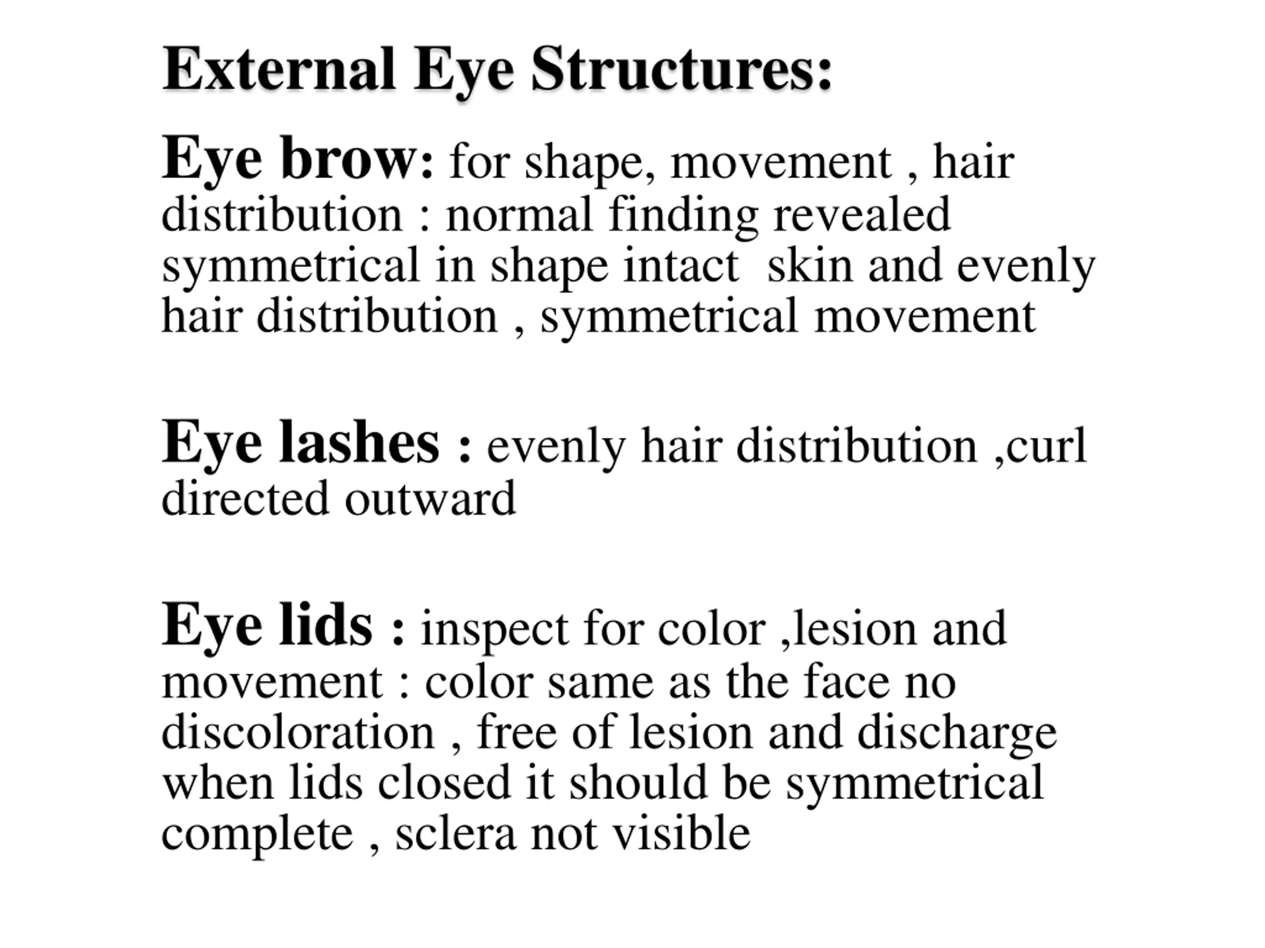 External Eye Structures: Eye brow: for shape, movement , hair distribution : normal finding revealed symmetrical in shape intact skin and evenly hair distribution , symmetrical movement Eye lashes : evenly hair distribution ,curl directed outward Eye lids : inspect for color ,lesion and movement : color same as the face no discoloration , free of lesion and discharge when lids closed it should be symmetrical complete , sclera not visible