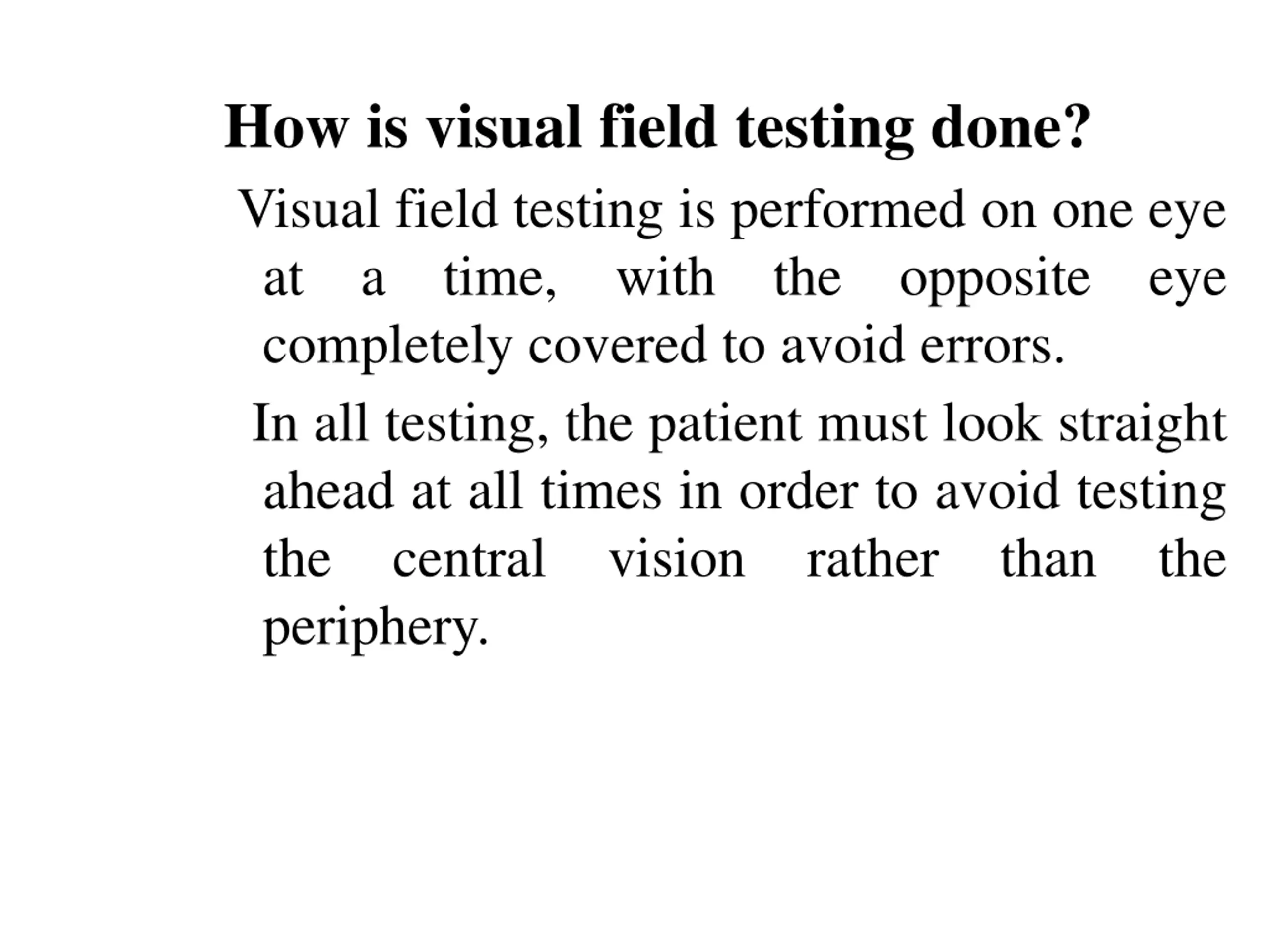 How is visual field testing done? Visual field testing is performed on one eye at a time, with the opposite eye completely covered to avoid errors. In all testing, the patient must look straight ahead at all times in order to avoid testing the central vision rather than the periphery.