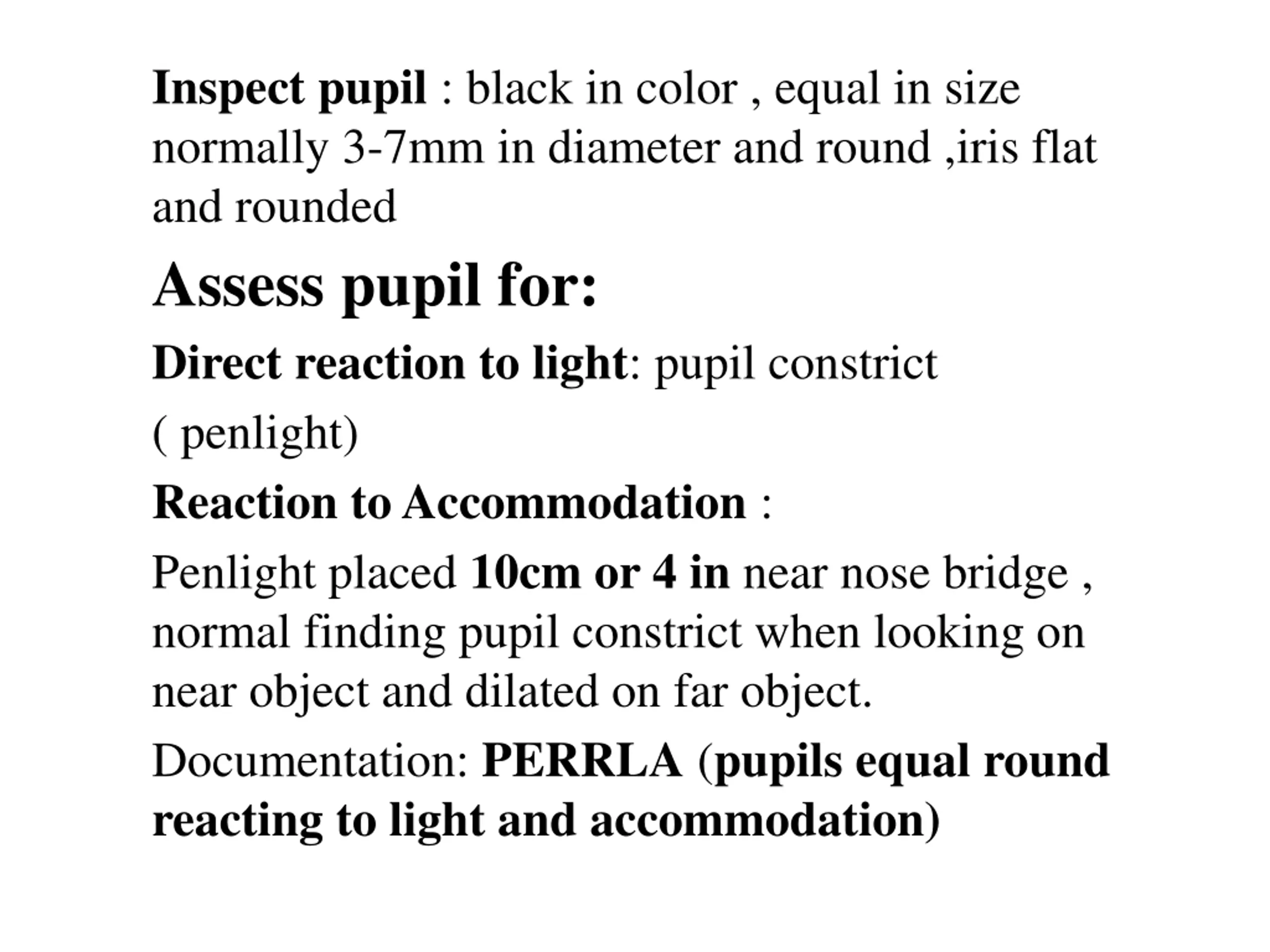 Inspect pupil : black in color , equal in size normally 3-7mm in diameter and round ,iris flat and rounded Assess pupil for: Direct reaction to light: pupil constrict ( penlight) Reaction to Accommodation : Penlight placed 10cm or 4 in near nose bridge , normal finding pupil constrict when looking on near object and dilated on far object. Documentation: PERRLA (pupils equal round reacting to light and accommodation)