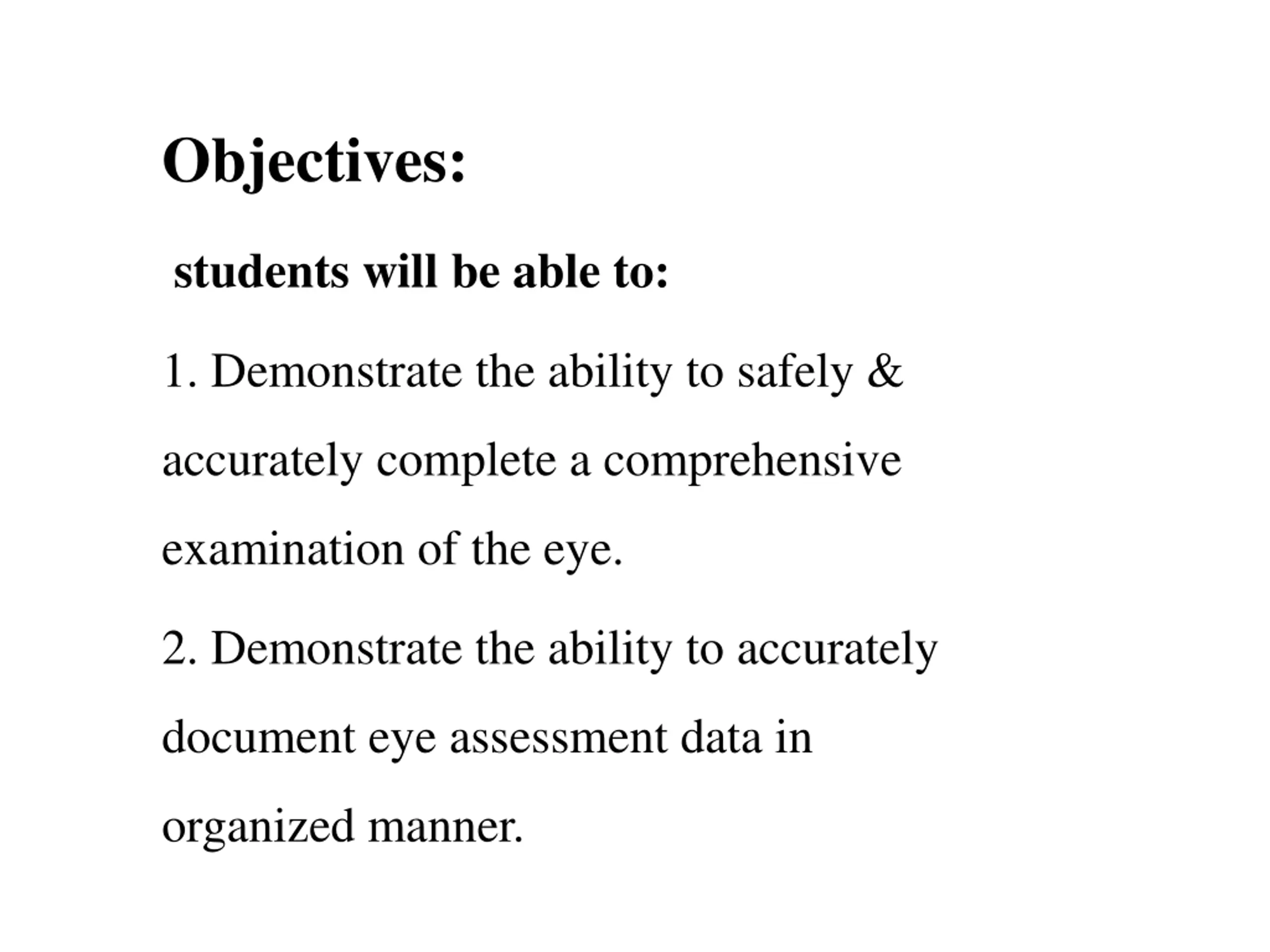 Objectives: students will be able to: 1. Demonstrate the ability to safely & accurately complete a comprehensive examination of the eye. 2. Demonstrate the ability to accurately document eye assessment data in organized manner.