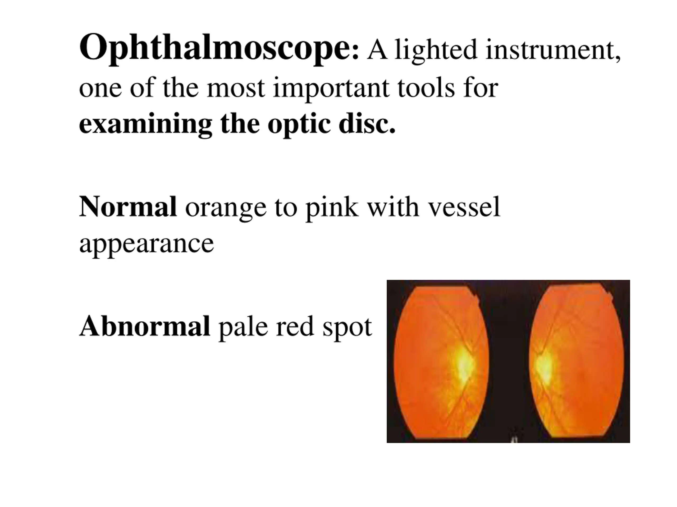 Ophthalmoscope: A lighted instrument, one of the most important tools for examining the optic disc. Normal orange to pink with vessel appearance Abnormal pale red spot