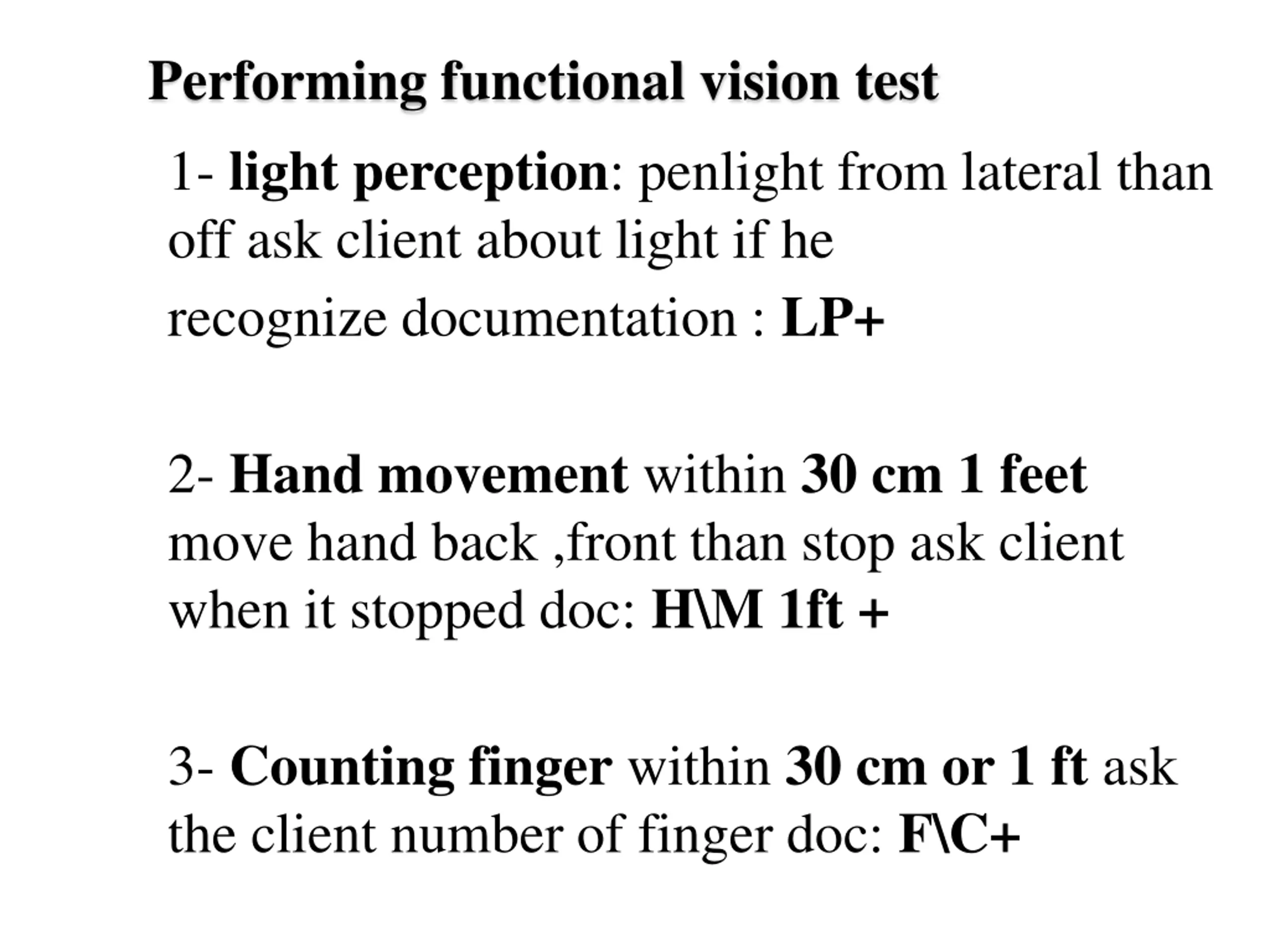 Performing functional vision test 1- light perception: penlight from lateral than off ask client about light if he recognize documentation : LP+ 2- Hand movement within 30 cm 1 feet move hand back ,front than stop ask client when it stopped doc: H\M 1ft + 3- Counting finger within 30 cm or 1 ft ask the client number of finger doc: F\C+