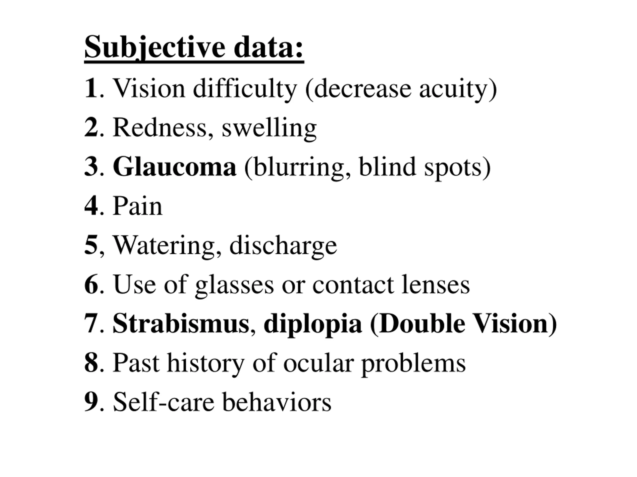 Subjective data: 1. Vision difficulty (decrease acuity) 2. Redness, swelling 3. Glaucoma (blurring, blind spots) 4. Pain 5, Watering, discharge 6. Use of glasses or contact lenses 7. Strabismus, diplopia (Double Vision) 8. Past history of ocular problems 9. Self-care behaviors