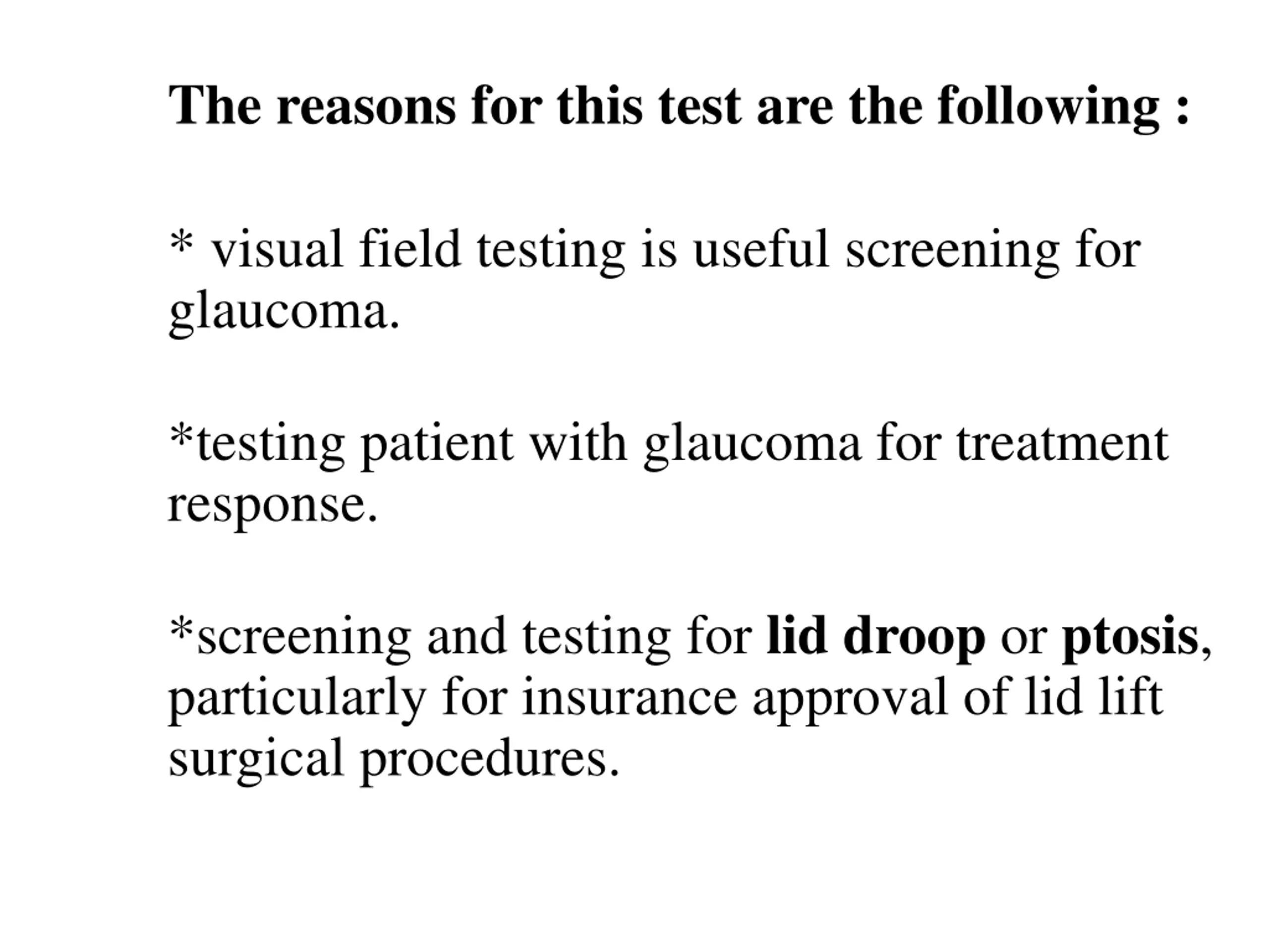 The reasons for this test are the following : * visual field testing is useful screening for glaucoma. *testing patient with glaucoma for treatment response. *screening and testing for lid droop or ptosis, particularly for insurance approval of lid lift surgical procedures.