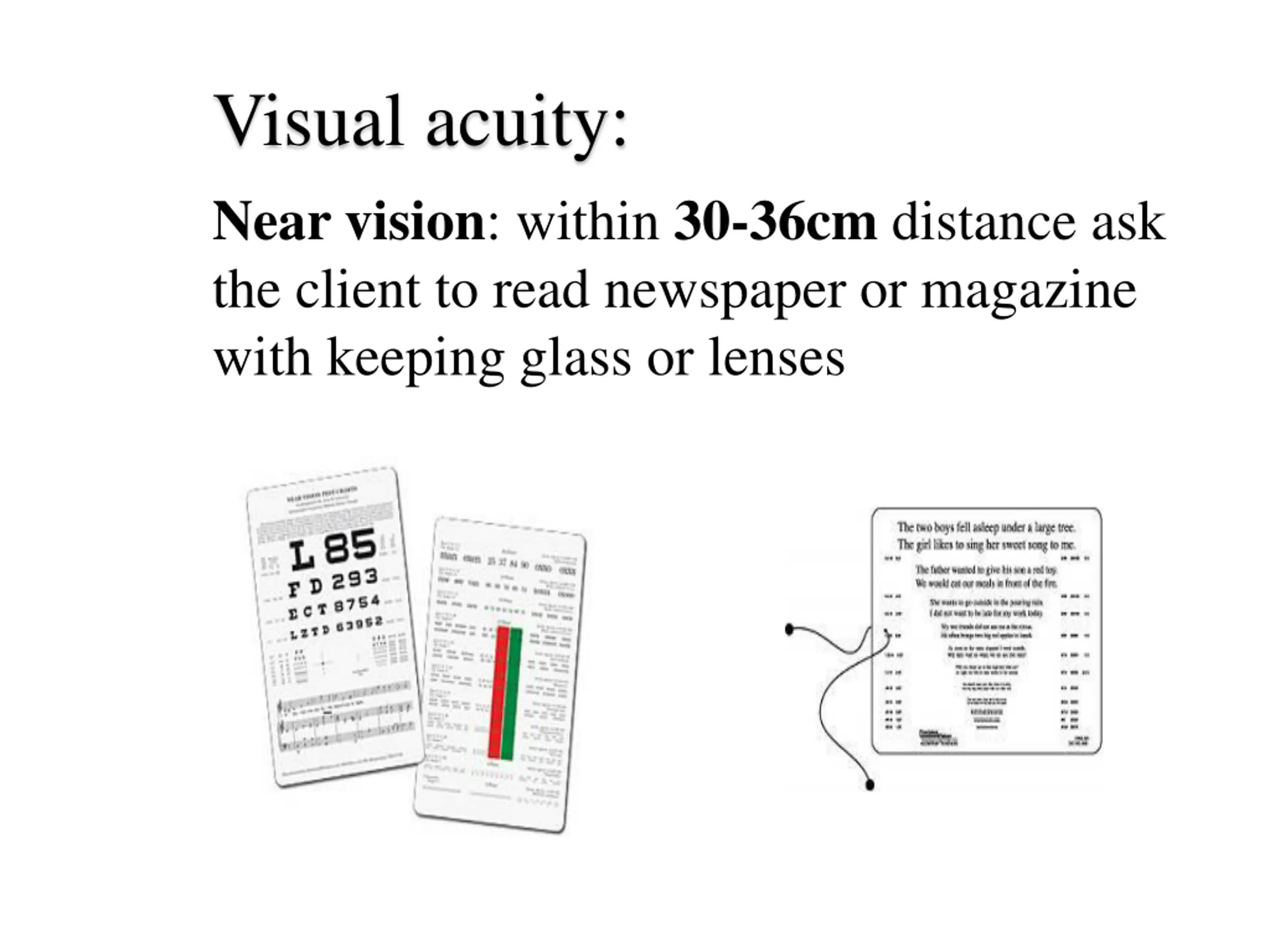 Visual acuity: Near vision: within 30-36cm distance ask the client to read newspaper or magazine with keeping glass or lenses