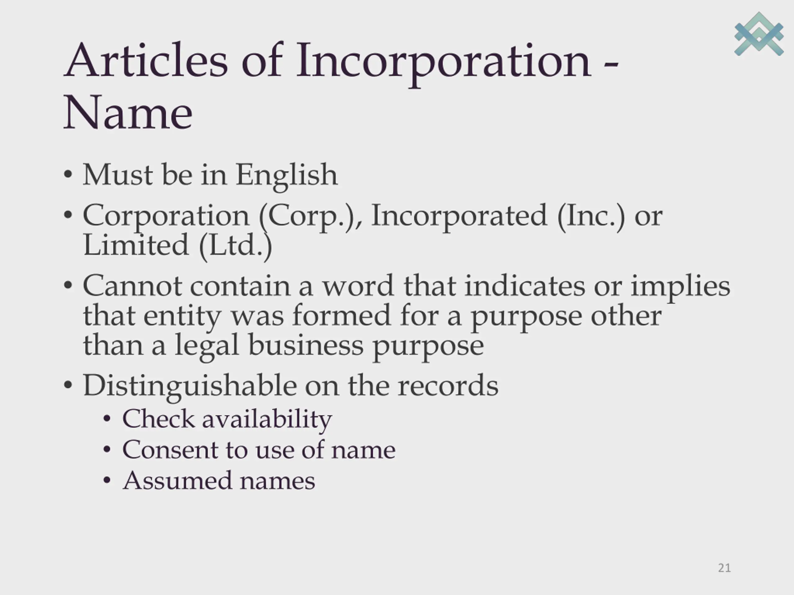 Articles of Incorporation - Name Must be in English Corporation (Corp.), Incorporated (Inc.) or Limited (Ltd.) Cannot contain a word that indicates or implies that entity was formed for a purpose other than a legal business purpose Distinguishable on the records Check availability Consent to use of name Assumed names 21