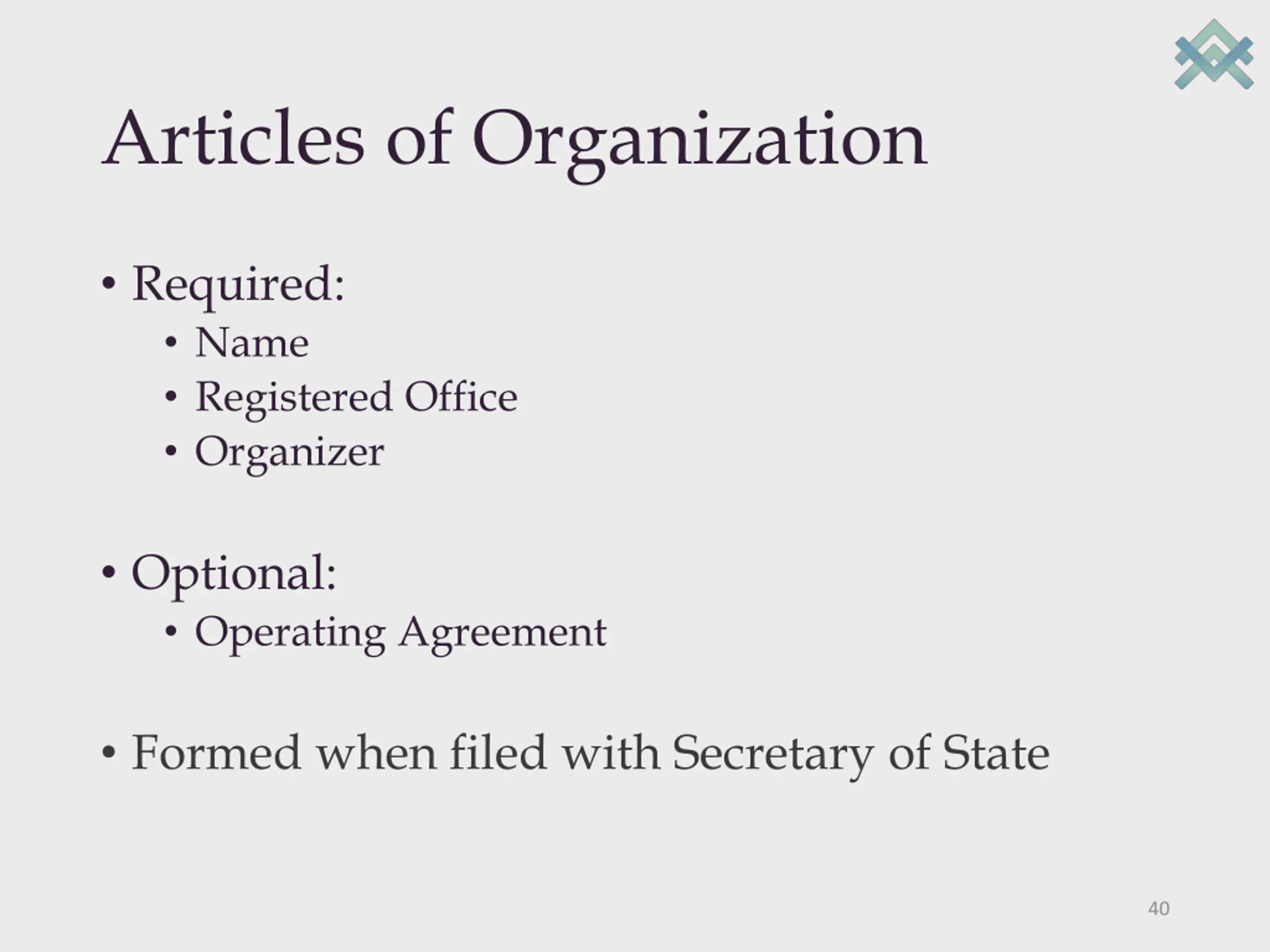 Articles of Organization Required: Name Registered Office Organizer Optional: Operating Agreement Formed when filed with Secretary of State 40