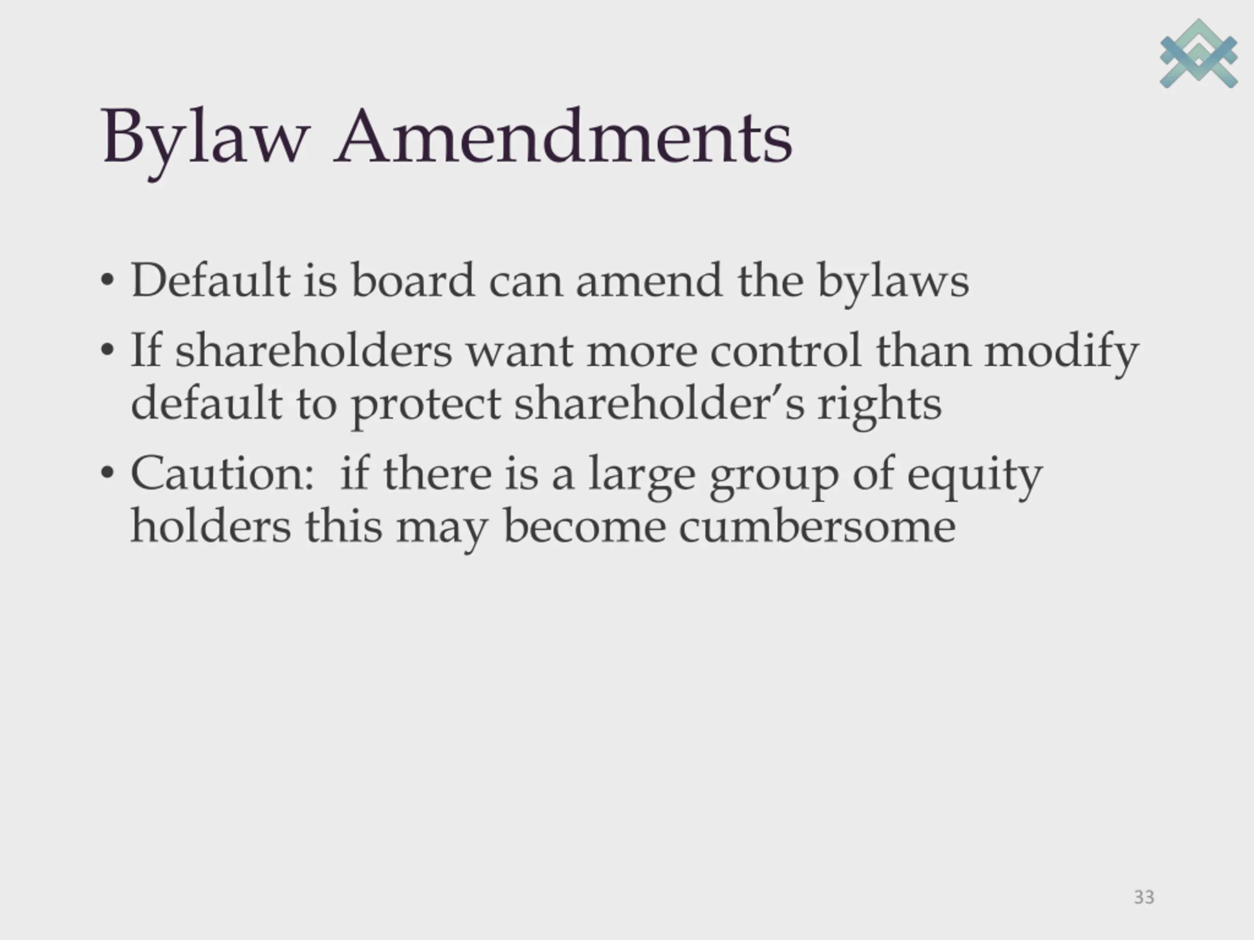 Bylaw Amendments Default is board can amend the bylaws If shareholders want more control than modify default to protect shareholder s rights Caution: if there is a large group of equity holders this may become cumbersome 33
