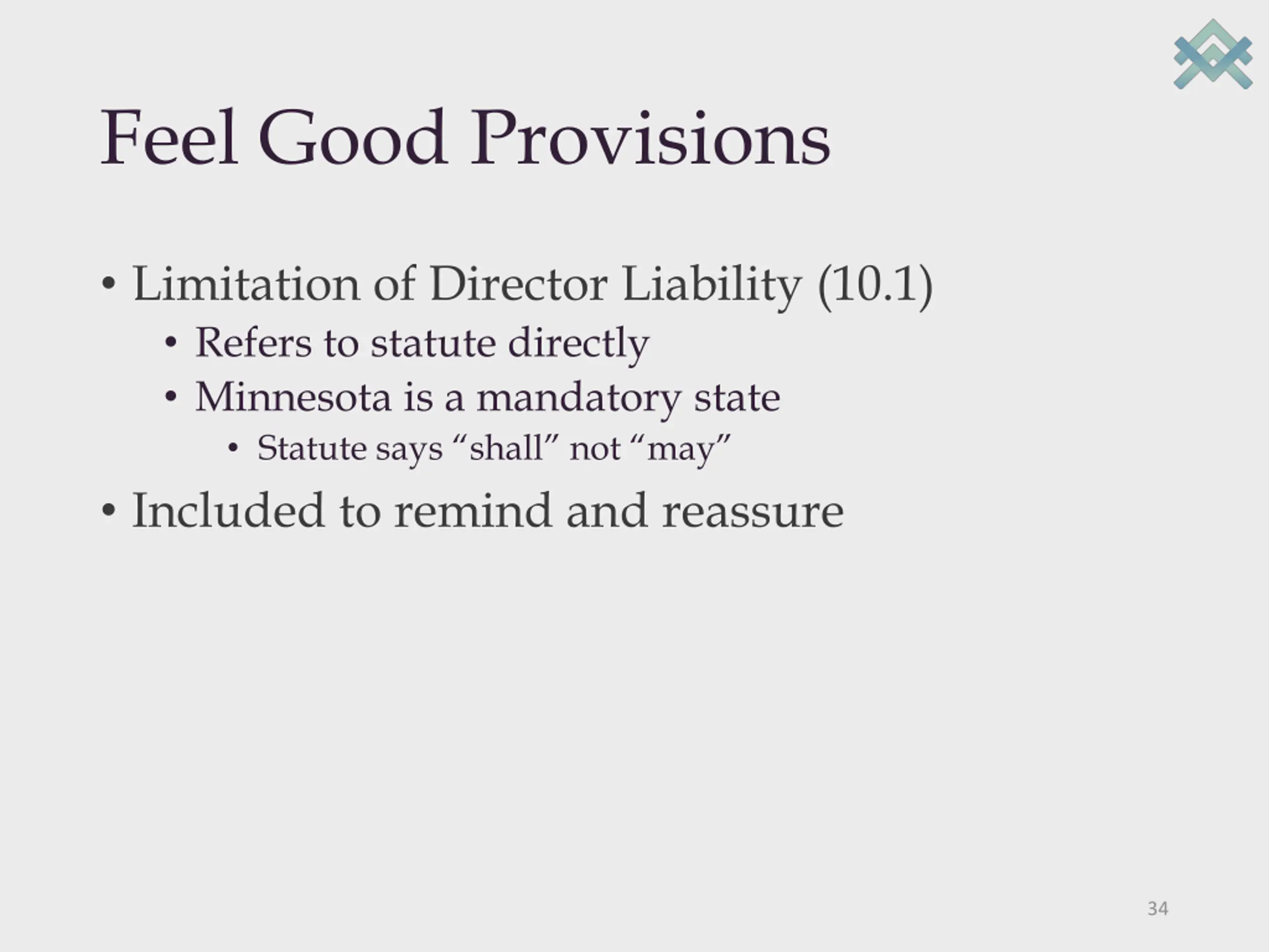 Feel Good Provisions Limitation of Director Liability (10.1) Refers to statute directly Minnesota is a mandatory state Statute says shall not may Included to remind and reassure 34