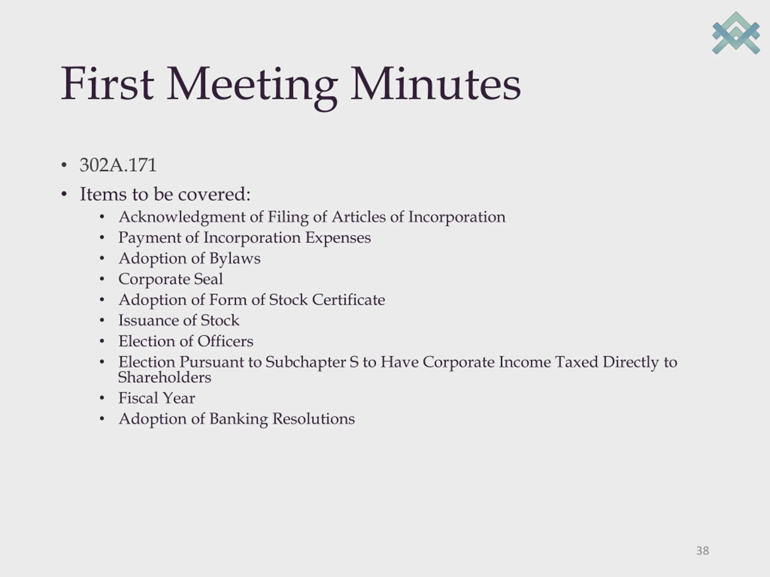 First Meeting Minutes 302A.171 Items to be covered: Acknowledgment of Filing of Articles of Incorporation Payment of Incorporation Expenses Adoption of Bylaws Corporate Seal Adoption of Form of Stock Certificate Issuance of Stock Election of Officers Election Pursuant to Subchapter S to Have Corporate Income Taxed Directly to Shareholders Fiscal Year Adoption of Banking Resolutions 38