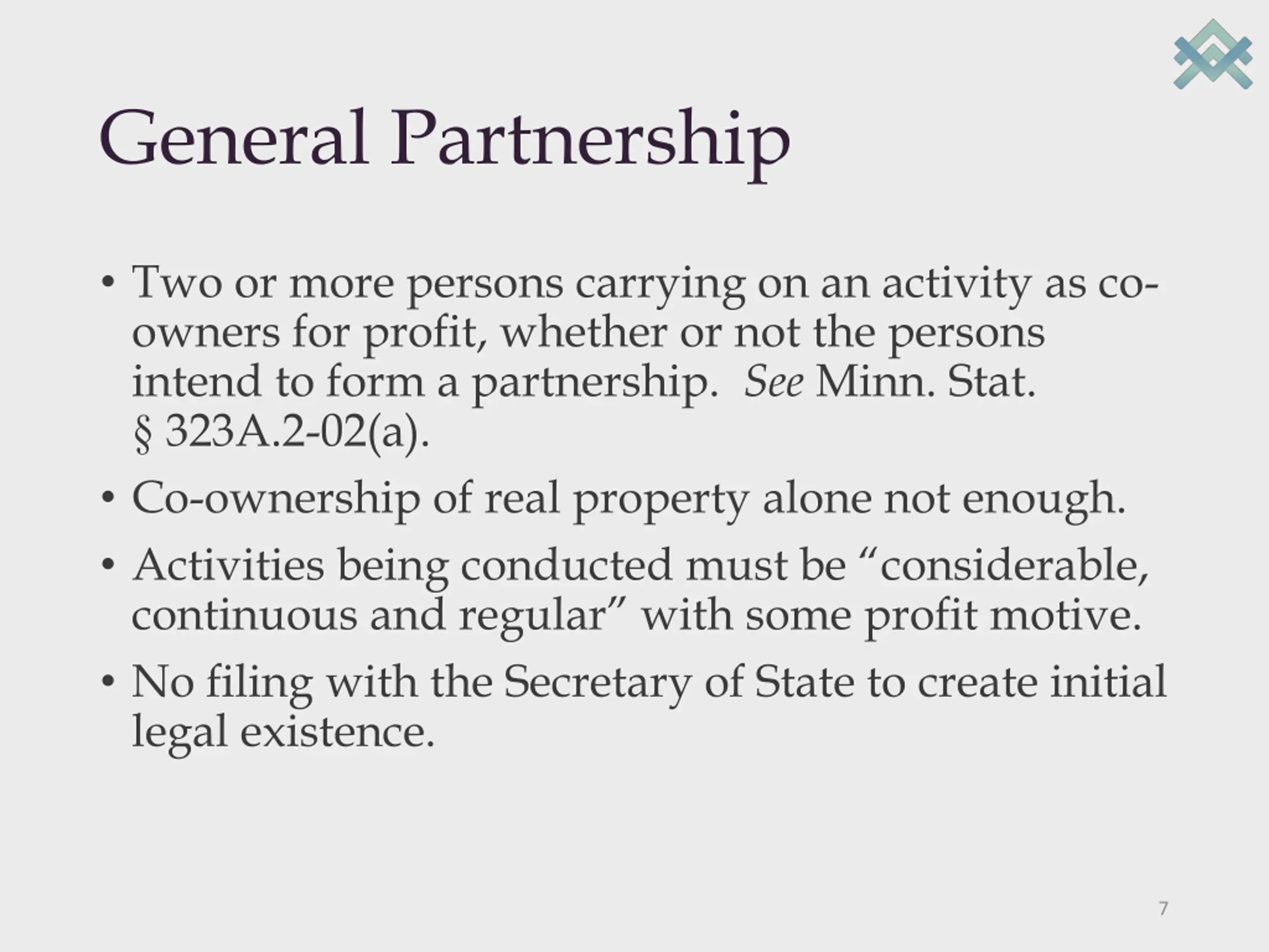 General Partnership Two or more persons carrying on an activity as co- owners for profit, whether or not the persons intend to form a partnership. See Minn. Stat. 323A.2-02(a). Co-ownership of real property alone not enough. Activities being conducted must be considerable, continuous and regular with some profit motive. No filing with the Secretary of State to create initial legal existence. 7