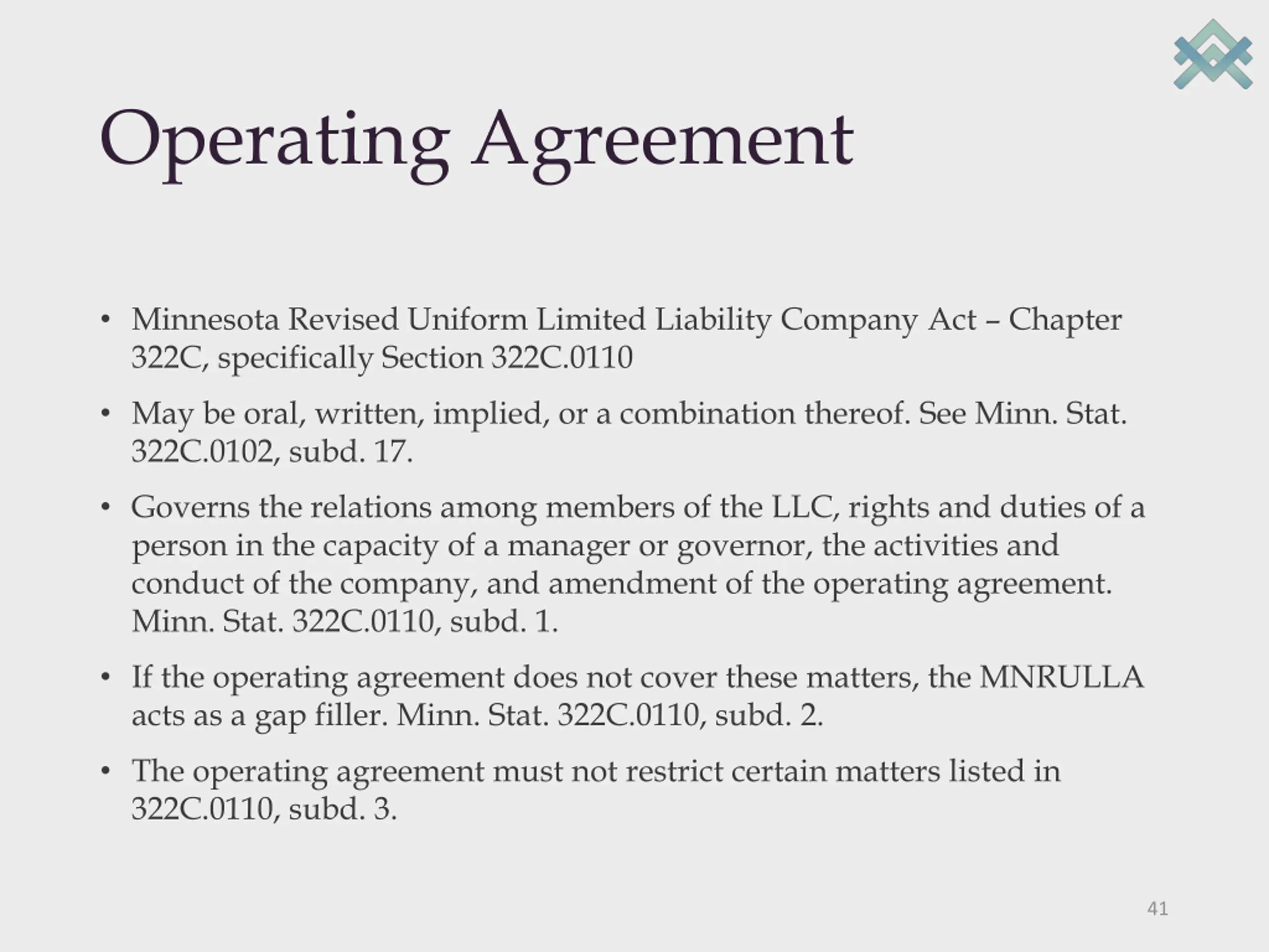 Operating Agreement Minnesota Revised Uniform Limited Liability Company Act Chapter 322C, specifically Section 322C.0110 May be oral, written, implied, or a combination thereof. See Minn. Stat. 322C.0102, subd. 17. Governs the relations among members of the LLC, rights and duties of a person in the capacity of a manager or governor, the activities and conduct of the company, and amendment of the operating agreement. Minn. Stat. 322C.0110, subd. 1. If the operating agreement does not cover these matters, the MNRULLA acts as a gap filler. Minn. Stat. 322C.0110, subd. 2. The operating agreement must not restrict certain matters listed in 322C.0110, subd. 3. 41