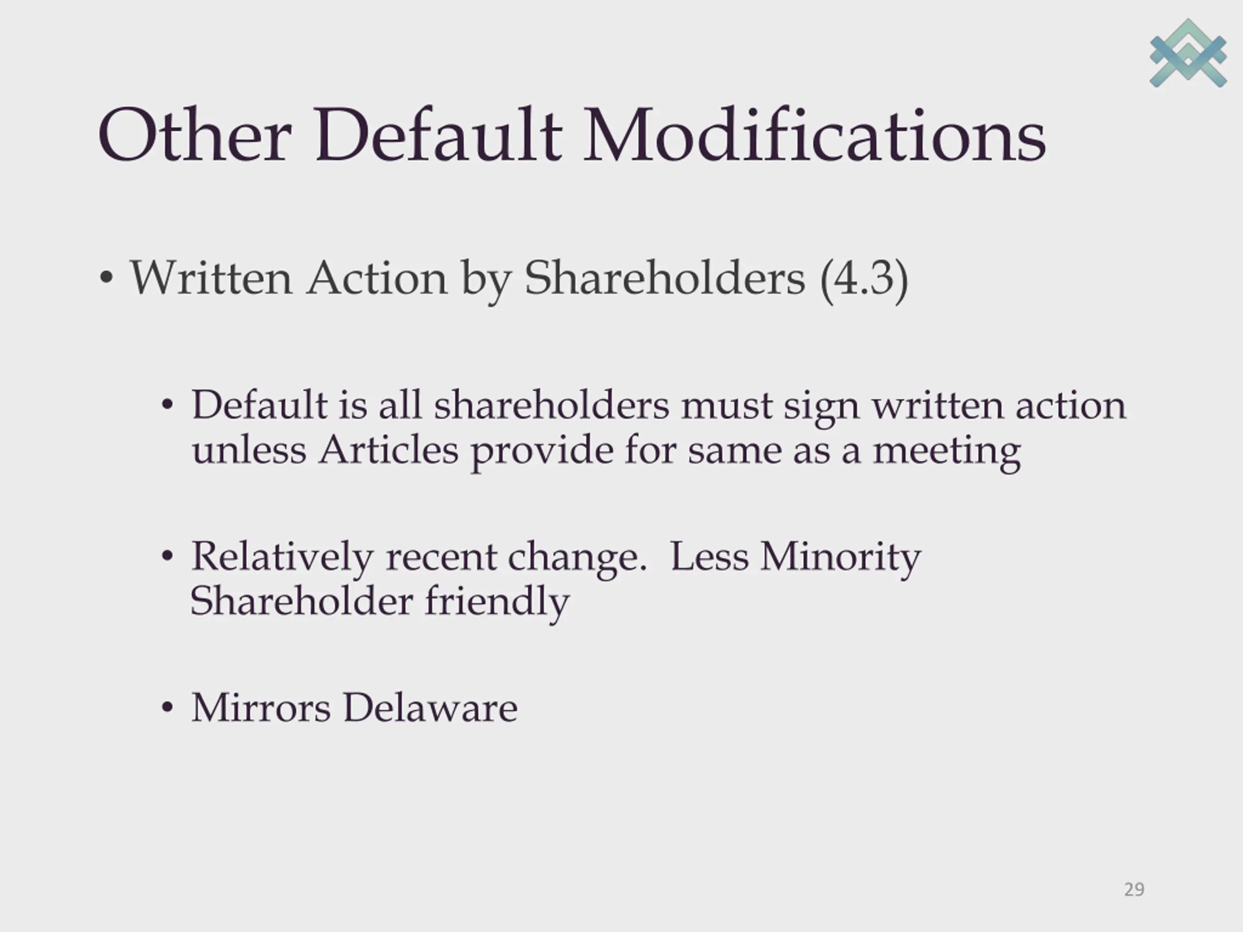Other Default Modifications Written Action by Shareholders (4.3) Default is all shareholders must sign written action unless Articles provide for same as a meeting Relatively recent change. Less Minority Shareholder friendly Mirrors Delaware 29