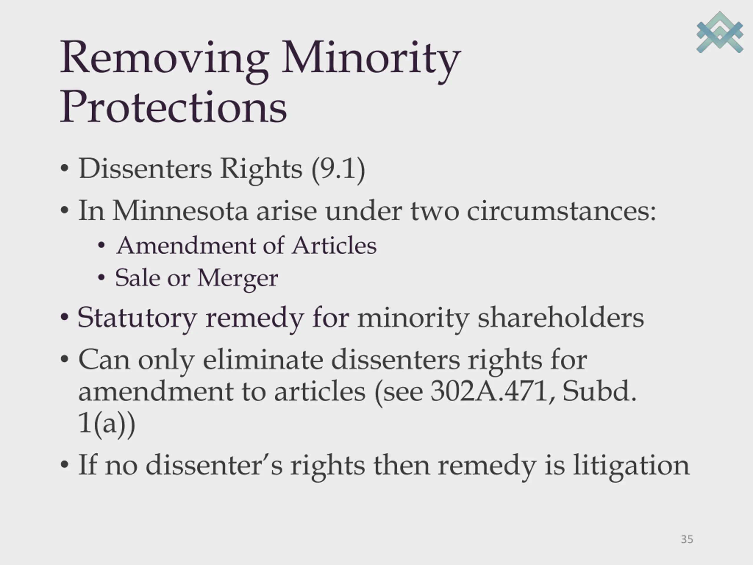 Removing Minority Protections Dissenters Rights (9.1) In Minnesota arise under two circumstances: Amendment of Articles Sale or Merger Statutory remedy for minority shareholders Can only eliminate dissenters rights for amendment to articles (see 302A.471, Subd. 1(a)) If no dissenter s rights then remedy is litigation 35