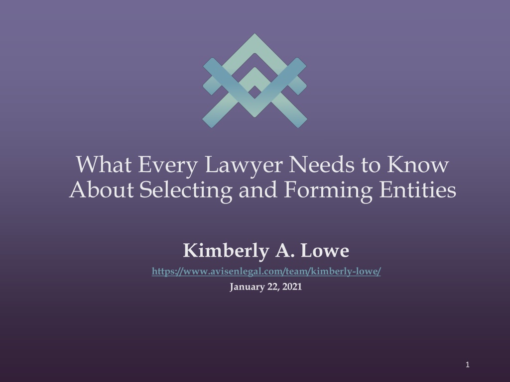 What Every Lawyer Needs to Know About Selecting and Forming Entities Kimberly A. Lowe https://www.avisenlegal.com/team/kimberly-lowe/ January 22, 2021 1