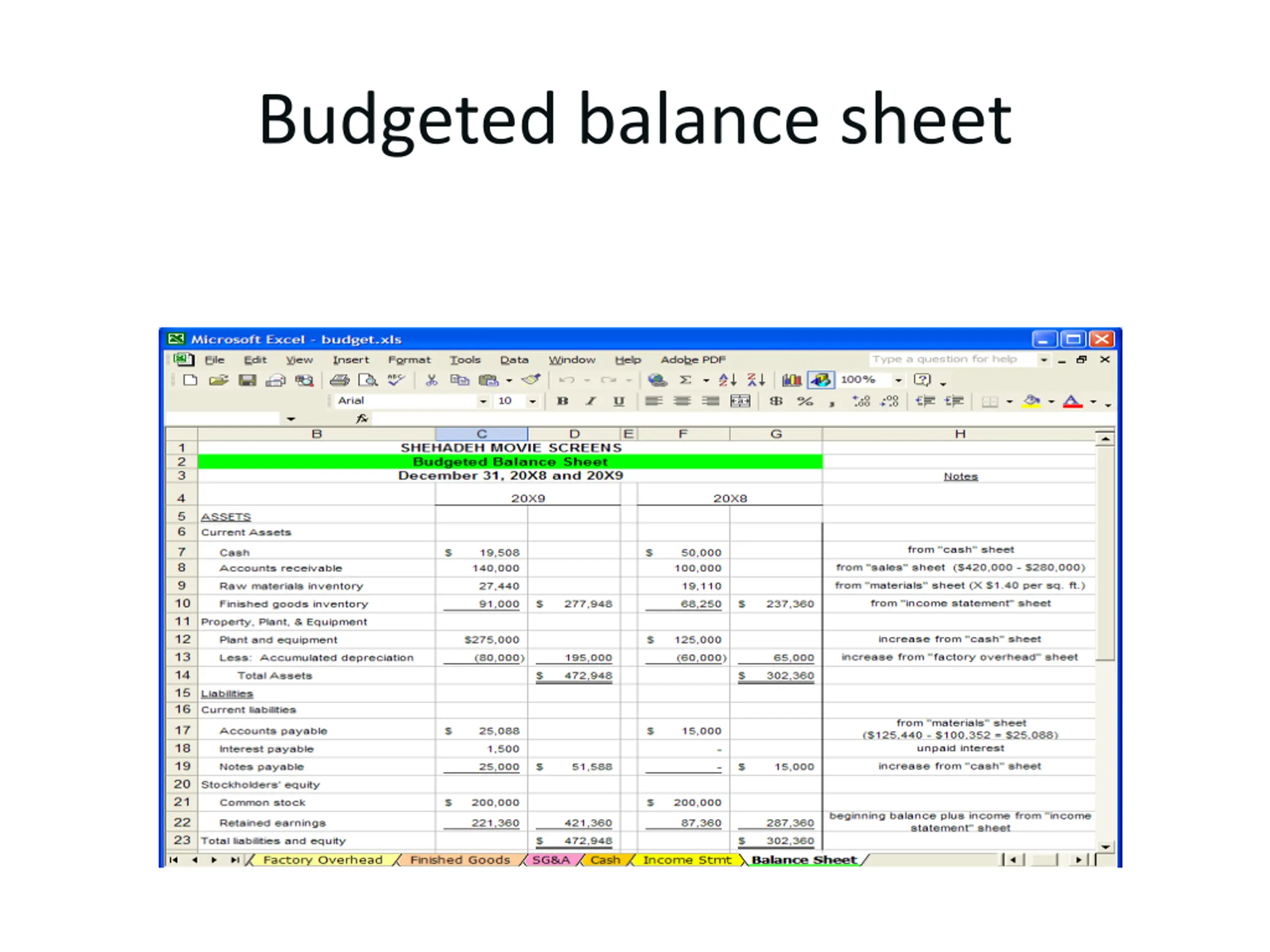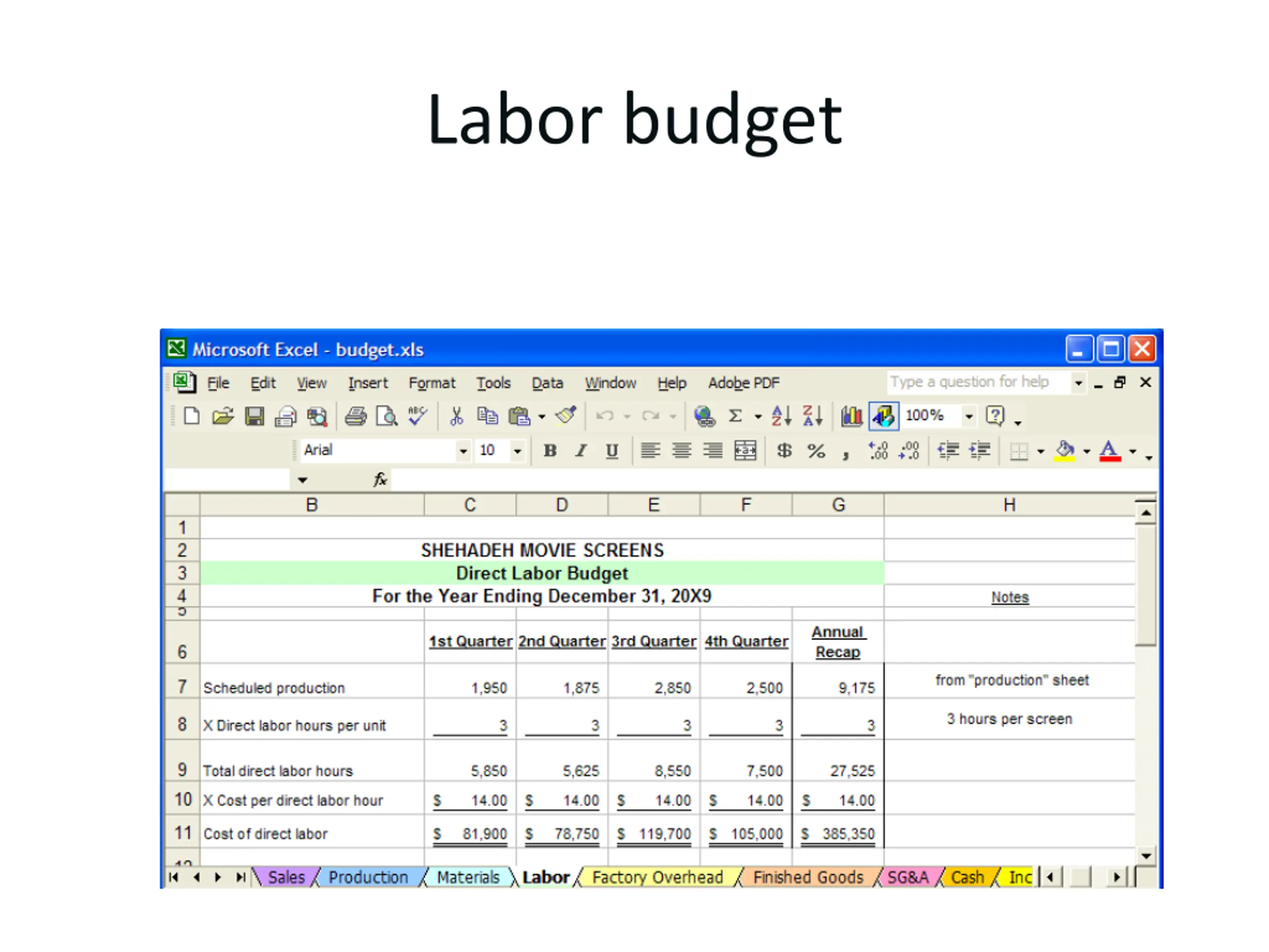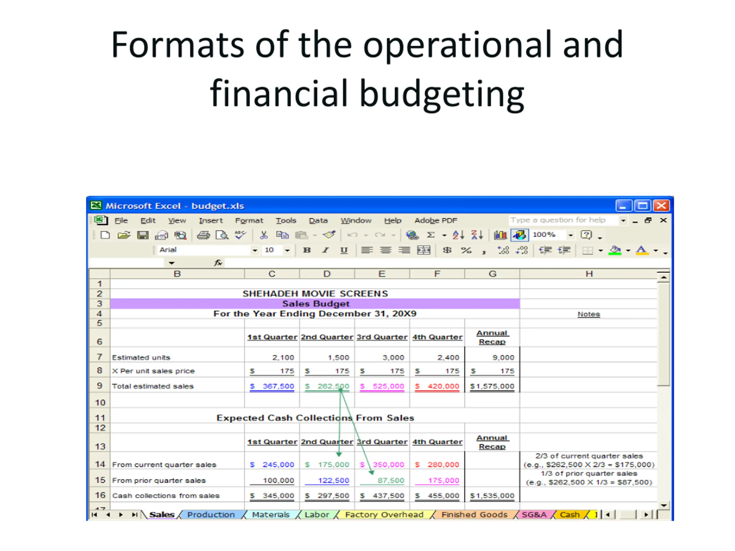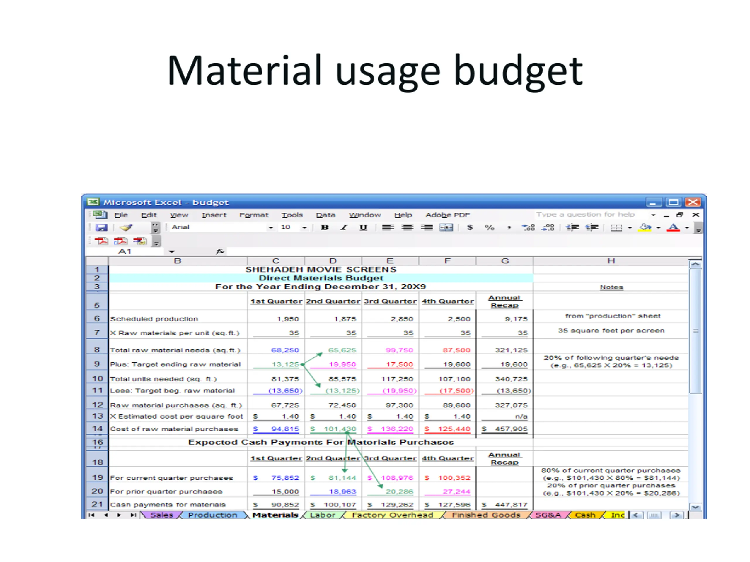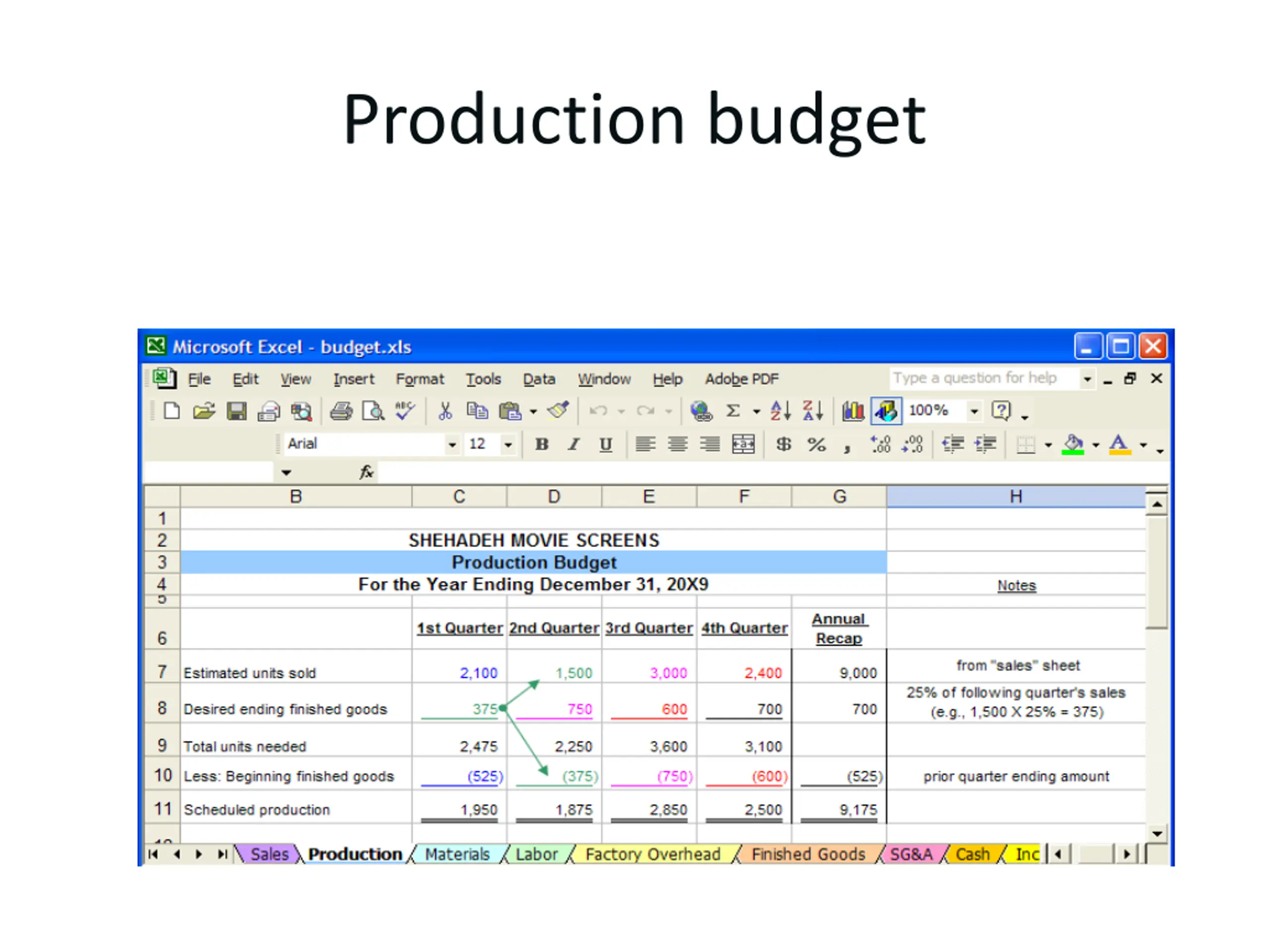 Budget cycle 1. 2. Identify business objectives Forecast future conditions (1) general economic conditions, (2) industry trends, (3) market research studies, (4) anticipated advertising and promotion, (5) previous market share, (6) changes in prices, and (7) technological developments Develop detailed sales budgets by market segments, major customers and product groups Prepare production budgets for the goods or services needed to satisfy the sales forecast and maintain agreed levels of inventory. 3. 4.
